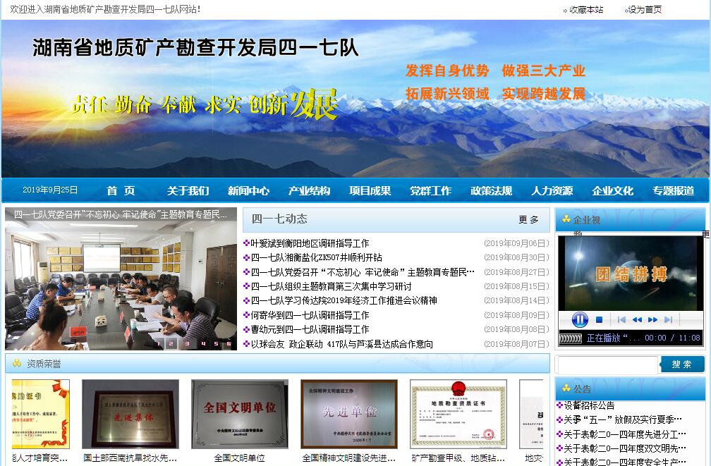 湖南省地质矿产勘查开发局四一七队,始建于1964年,是一支以地质勘查、勘测施工、盐卤井定向钻探施工为主的综合地质队。具有固体矿产勘查、地质钻探、岩土工程勘察、地灾评估、勘查、设计、施工等甲级资质。现有在职职工434人,拥有各类专业技术人员276人,其中高级职称58人,中级职称76人,获得国务院政府特殊津贴的科技专家3名。拥有一批注册岩土工程师、注册建造师、注册造价师、注册监理工程师、注册安全工程师,地质、钻探、水工环、测绘等高级工程师。建队以来,充分发挥人才、设备和技术优势,积极为国家和地方经济建设提供优质地质资源和地质技术服务,先后在衡阳市及毗邻地区发现矿种100余种,发现矿产地400余处,提交各类报告1000余份。累计探明锡矿29.13万吨,铜矿65.69万吨,钨矿6万吨,铁矿50259.4万吨,铅锌矿278万吨,岩盐矿138亿吨,钙芒硝矿15亿吨,萤石矿718万吨,钠长石矿4786.7万吨,高岭土矿2268.5万吨,硼矿480万吨,硅灰石矿363.7万吨,这些地质矿产成果为衡阳市赢得了“非金属矿产之乡”、“有色金属之乡”的美誉。由于找矿成果突出,先后荣获部、省、厅、局各类地质科技奖、找矿成果奖50余个,并被授予“湖南省文明单位”、“全国精神文明建设工作先进单位”、“全国文明单位”等光荣称号。