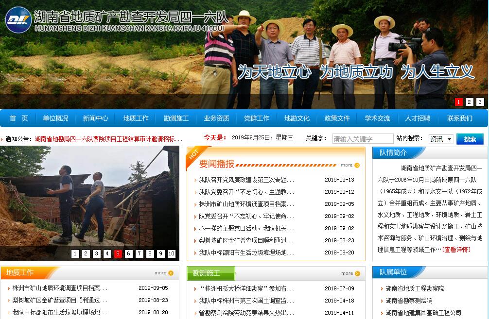 湖南省地质矿产勘查开发局四一六队于2006年10月由局所属原四一六队(1965年成立)和原水文一队(1972年成立)合并重组而成。主要从事矿产地质、水文地质、工程地质、环境地质、岩土工程和灾害地质勘察与设计及施工、矿山技术咨询与服务、矿山环境治理、测绘与地理信息工程等领域工作。几十年来,累计探明煤炭、铅锌、钨锡、铁、银、萤石、优质高岭土等多种金属和非金属资源,探明大型以上矿床4处、中型11处;完成湖南省区域水文地质普查、矿泉水资源调查、地质灾害调查、地质环境调查评价等多个水工环项目。先后获全国科技大会奖,部、省级找矿和成果奖,创立了全国地质找矿勘查机制新模式—锡田模式,为新形势下地质找矿工作提供了全新的思路,对全国地质找矿工作具有非同寻常的指导意义。与此同时,积极发挥专业技术优势,融入地方经济建设,先后出色地完成了数百项国家及省级重点工程项目,在汶川地震灾区地灾调查和灾后重建勘查及西南地区抗旱找水工作中,出色完成各项任务,并有100多项分别获得国家、省部级工程勘察奖,为地质事业和地方经济发展做出了重要贡献。是全国地质勘查行业“优秀地勘单位”、全国勘察协会“诚信单位”、湖南省厂务公开先进单位,是湖南省“文明标兵单位”。全队现有职工1644人,其中在职746人,离退休898人。在职人员中,管理人员42人,各类专业技术人员410人(高级职称63人、中级职称110人、初级职称214人),工勤技能人员292人。全队具有地质找矿、工程勘察、工程施工、测绘、地质灾害等五大类资质,分属于四一六队、湖南省地质工程勘察院、湖南省勘察测绘院、湖南省地建集团基础工程公司。通过资质建设的不断加强,使队具有了除地质找矿工作外,能够充分发挥水文地质、工程地质、环境地质及工程测绘等领域的技术与产业优势,积极服务经济社会发展的能力。“十一五”以来,在工业与民用建筑、道路桥梁、国家重大工程基础设施建设、地质灾害防治、矿山环境评价、农业地质、城市地质、数字城市等多个专业领域取得了显著工作成效,树立了良好的市场声誉和社会形象。