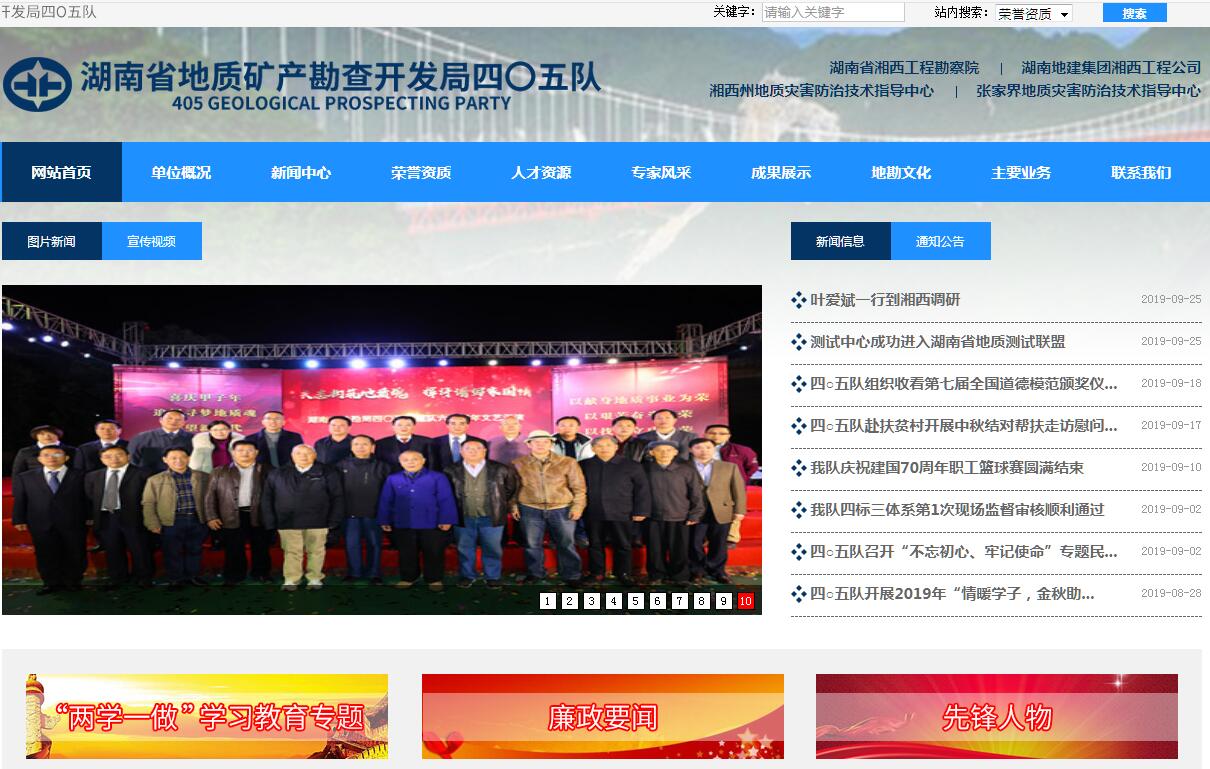 1958年8月组建于湘西自治州桑植县利福塔镇,单位名称为湖南省地质局澧北队,1963年与湘西地质局合并为湖南省地质局四〇五地质队,1967年队部迁至湘西自治州吉首市人民中路231号,1999年更名为湖南省地质矿产勘查开发局四〇五队。四〇五队是一支综合型地质勘查单位。建队以来一直承担着湘西(含湘西州、张家界地区)区域性地质找矿等国家公益性项目。2010年以来,四〇五队积极适应新形势,由传统地质找矿为主逐步转变为以“基础性、公益性、战略性”地质工作为根、以“大地质”技术服务为基的技术型队伍。2015年四〇五队与当地政府部门联合组建了湘西州地质灾害防治技术指导中心、张家界地质灾害防治技术指导中心;2017年组建湘西州矿山监测技术服务中心。现有在职职工296人,离退休人员410人。其中研究员级职称8人,高级职称54人,享受国务院特殊津贴专家3人,注册(岩土)工程师3人,注册安全工程师1人,注册人力资源师1人,注册会计师1人,二级建造师执业资格15人。现持有岩土工程勘察、设计,地质灾害危险性评估,地质灾害治理工程勘查、设计、施工等10个甲级资质;冶金矿山工程设计、地质实验测试、地球物理化学、测绘等12个乙级资质;地基与基础施工二级、湖南省农村土地承包经营权确权登记颁证工作及湖南省第二次全国地名普查外包资格证书。目前拥有可控源音频大地电磁测深、地质雷达、火焰—石墨炉原子吸收光谱仪、德国耶拿进口设备、高精度GNSS接收机、手持GPS、望远镜测距仪、无人飞型器、千米钻机、便携式钻机、岩土计算、深基坑支护结构设计、降水沉降分析、工程预算等专业软件等满足业务市场开拓需要的技术装备达千万元以上。