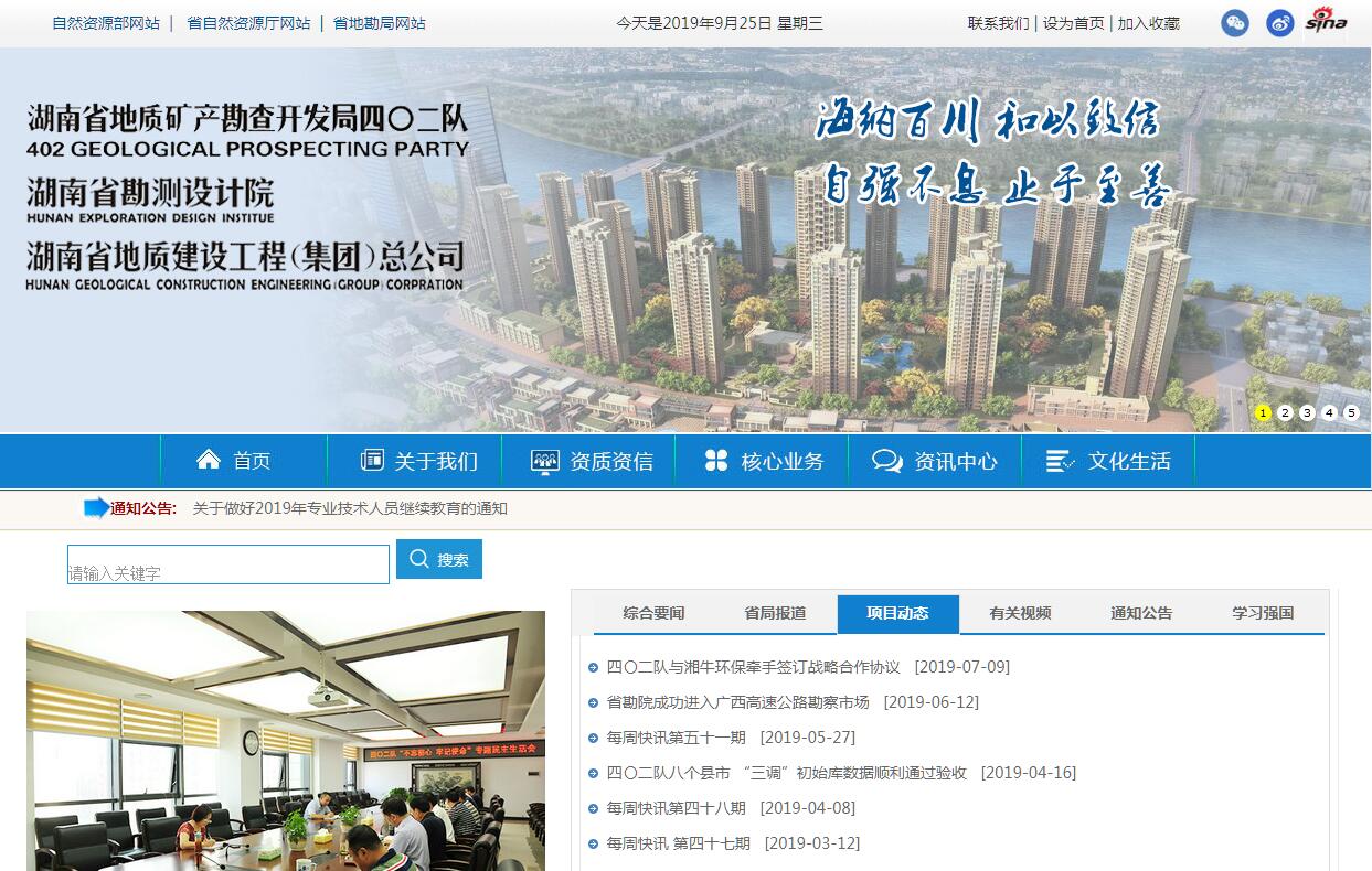 湖南省地质矿产勘查开发局四〇二队成立于1952年,是新中国最早组建的六支地质队之一。2007年,四〇二队与省水文二队、省地质建设工程(集团)总公司合并重组。目前,全队拥有职工1800人,其中在职职工817人,各类专业技术人员占职工总数的60%以上。主要从事矿产地质、水工环地质、灾害地质、基础地质、矿山地质;工程勘察、测量测绘(地理信息)、试验检测、工程监测、土地规划;基础工程、房屋建筑、水利水电、市政公用、公路工程施工等。是一支历史悠久、学科齐全、专业配套的综合性地勘队伍。是全国“守合同重信用单位”、全国“工程勘察与岩土行业诚信单位”、全国“模范职工之家”、湖南省“文明单位”。六十多年来,我队累计发现和勘查各种矿产地500余处,探明储量矿种48种,潜在经济价值5000亿元以上,曾荣获地矿部“找矿有重大贡献单位”、“地质找矿功勋单位”、“找矿集体一等功”等称号。近年来,提交了平江大洞、万古大型金矿床2处,平江栗山大型铅锌矿床1处,中型金铜铅锌矿床5处,新发现矿产地10余处,让湘东北地区成为了湖南和全国的重要矿集区。六十多年来,我队一直承担着湖南省水文地质工程地质环境地质调查工作,完成了洞庭湖地区、长株潭地区地下水与环境地质调查,为湖南经济社会发展提供着水工环地质技术支撑。近年来,在地下水资源、地下热水资源、矿泉水资源、浅层地温能、干热岩、页岩气勘查等领域走在前列,干旱地区找水被老百姓亲切地称为“人民找水队”;主动参与凤凰沱江大桥抢险、全省地质灾害防治、资源枯竭型城市矿山环境恢复治理、湘江流域重金属治理,有力保障了老百姓的生命财产安全。六十多年来,我队充分利用地质技术优势,积极参与国家重大基础工程建设。近年来,完成了矮寨大桥边坡支护、九龙仓长沙国际金融中心基坑支护、长沙地铁工程勘察、长沙国际会展中心和万家丽路快速化改造工程测试、不动产统一登记基础数据建设等一大批重大项目,为推动城市建设和社会发展发挥了重要作用。站在新的起点,我们将继续弘扬“三光荣”优良传统,秉承“求是、创新、勤奋、奉献”的四〇二队核心价值观,坚持“大地质、大服务、大发展”工作理念,砥砺奋进,继往开来,谱写找矿立功、服务社会、富民强队新篇章!