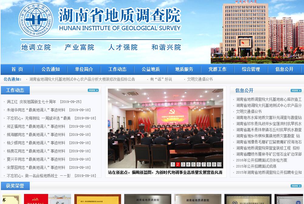 湖南省地质调查院隶属湖南省地质矿产勘查开发局,是经省编委批准,以承担基础性、公益性、战略性地质调查任务为基本职责,以服务经济社会发展为根本宗旨,集生产和科研于一体,精兵加现代化技术装备的省级地调院,是省委省政府批准的公益一类事业单位。湖南省地质调查院最早为1958年成立的湖南省地质局区域地质测量队(后更名为湖南地质调查研究院)。2007年5月,湖南省地勘局党组为贯彻落实《国务院关于加强地质工作的决定》、省政府《关于湖南地质勘查队伍管理体制改革会商纪要》等有关精神,进一步建实做强湖南省地质调查院,将湖南省地质调查院与湖南地质调查研究院合并重组为新的湖南省地质调查院。2011年5月,迁入长沙云塘基地湖南地质大厦。2013年7月,经省编办批准,加挂湖南省地质矿产勘查开发局油气资源调查中心牌子。2014年12月,经湖南省地勘局批准,湖南工程职业技术学院原大托铺校区(现为湖南省地质调查院大托基地)划给我院,为单位的发展创造更广阔的发展空间。湖南省地质调查院下设基础地质分院等二级机构共18个。全院在职职工459人,其中∶中、高级职称者176人(含研究员级高级工程师7人),硕士及以上学历者56人,本科及大专学历者265人。持有国土资源部颁地质勘查等甲级资质8个,涉及专业领域20多项;拥有湖南省国土资源厅颁发的地灾勘查等乙级资质10多项;2016年,通过质量管理体系、环境管理体系、职业健康安全管理体系认证。曾获得地质部颁发的地质找矿嘉奖,“大庆式企业”称号;地质矿产部地质找矿功勋单位;国土资源部“全国地质勘查行业先进集体”、“全国地勘行业优秀地质找矿项目”奖,“全国地质灾害群测群防突出贡献奖”、“全国地质资料管理先进集体”、国土资源系统“模范职工之家”光荣称号;2006年,通过评审成为湖南省档案工作规范化管理特级单位。2009年底,获评全国首批、中南第一家省级公益性地质调查队伍能力建设评估A级单位,2013年以优异成绩通过复核评估。此外,还多次获得厅、市级文明单位、“省芙蓉标兵岗”、“市诚实守信单位”等称号。