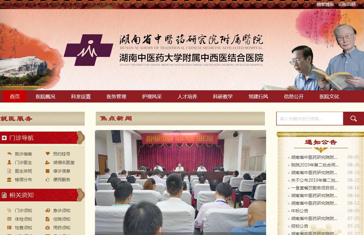 湖南省中医药研究院附属医院是一所集医疗、科研、教学、预防、保健、社区医疗服务为一体的综合性三级甲等中医医院,为全国首批重点中西医结合医院,系湖南省干部保健基地,也是湘江新区唯一一家三级甲等中医医院。现为第二批国家中医临床研究基地,国家中西医结合防治重大疑难疾病原发性肝癌病种牵头单位,医院“肿瘤病科”和“老年病科”成功入选国家区域中医(专科)诊疗中心。位于湖南省会长沙,坐落于国家级风景名胜区岳麓山下、风景秀丽的湘江西畔。医院始点于1957年3月17日,其前身是湖南中医药研究所临床研究室。湖南省中医药研究所1966年并入湖南中医学院, 1985年10月升格为厅局级科研事业单位,更名为湖南省中医药研究院。 1991年5月成立湖南省中医药研究院附属医院(与中医临床研究所一个机构两块牌子)。1996年12月被国家中医药管理局授牌为“三级甲等中医医院”。2003年5月增名为湖南中医学院附属中西医结合医院,于2006年增名湖南中医药大学附属中西医结合医院(与湖南省中医药研究院附属医院一个机构两块牌子),同年11月被国家中医药管理局确定为全国重点中西医结合医院创建单位。2008年3月以优异成绩通过国家中医药管理局组织的评审验收,成为全国十所重点中西医结合医院之一,还被中国中西医结合学会授予“中西医结合先进集体”荣誉称号。医院名医荟萃,人才辈出,湖南“中医五老”中的李聪甫、刘炳凡、欧阳錡等生前曾业医于斯;目前湖南“新中医五老”中“三老”刘祖贻、孙光荣、潘敏求亦出自于此。医院现有在职职工775人,医院拥有具有高级职称的专家141名,另有国医大师2名(刘祖贻研究员、孙光荣教授是省内首先当选的国医大师),全国名中医1名(潘敏求教授是国家首次评选国家级名中医当选的全国名中医),享受国务院政府特殊津贴专家22名,享受湖南省政府津贴2名,省名中医16名,名老中医药专家、中西医结合专家15名,医院作为湖南中医药大学的临床教学医院,现有博士生导师8名,硕士生导师36名,以及一批具有真才实学的中青年技术骨干。医院环境优雅、名医荟萃、设备先进、医术精湛、药材道地、服务优质、执业规范。医院与研究院临床所、肿瘤所合署运行,开放床位860张,共有19个病区;设有35个临床科室,9个医技科室,10个研究室,9个教研室。我院拥有一批优势专业学科及平台,有国家级重点中医临床专科3个(肿瘤科、老年病科、脑病科),国家中医药管理局重点专科5个(肿瘤科、脑病科、老年病科、心血管科、护理学)、重点学科4个(中医肿瘤病学、中西医结合临床(心脑血管疾病方向)、中医老年病学、中医骨伤科学),省重点专科7个(中西医结合肿瘤、 中西医结合脑病、 中西医结合脊柱•骨关节病科、中西医结合心血管病科、中西医结合肛肠病科、护理、消化科);建有省级重点研究室1个(肝癌证治研究室)。为国家食品药品监督管理局确定的首批中药新药临床研究基地、药品临床实验机构;是国务院批准的首批硕士学位授予点,有中医、中西医结合博士、硕士、学士三级学位授予权,设有中西医结合一级学科博士后科研流动站;为国家首批中医住院医生规范化培训基地,拥有国医大师工作室1个(刘祖贻)、全国名中医传承工作室1个(潘敏求)、全国中医学术流派传承工作室1个(湖湘欧阳氏杂病流派传承工作室)、全国名老中医药专家传承工作室8个(刘祖贻、张崇泉、潘敏求、刘炳凡、蔡光先、蒋士生、郑纯、仇湘中)、湖南省名老中医药专家传承工作室2个(黄柏良、蒋益兰)。医院湖湘文化底蕴深厚,中医药特色突出,坚持以中为主、中西结合的方法服务于广大的老百姓,疗效显著,影响甚广。医院设备先进,配备有直线加速器、核磁共振、128层螺旋CT、高档胃肠镜、大型平板血管造影机(DSA)、DR、CR、高档全身彩超、全自动生化仪、全自动五分类血球仪、全自动发光免疫仪、流式细胞仪、高压氧、全层流手术室等先进医疗设备及设施。医院坚持“以中为主、中西结合”的办院方针和“名院、名科、名医、名术、名药”的品牌发展战略,形成了以中西医结合内科为主体优势,肿瘤、脑病、心血管、老年病、脊柱、大肠肛门病及呼吸、肾病、肝病、针灸、脱发等为专科特色的办院风格,以特色诊疗、特色制剂为主体内容的专科专病特色。肿瘤科突出以中医为主、中西医结合防治恶性肿瘤的特色和优势,开展中药介入治疗、放射治疗、射频消融和中药配合体外高频热疗等特色诊疗 提高了肿瘤客观疗效。脑病科将针灸、按摩、推拿等传统技术与康复手段溶为一体,开展了脑病康复治疗以及脑循环检测及中风急性期微创介入治疗等多项脑病诊疗技术。心血管科开展了心血管介入诊疗技术(冠状动脉造影、冠脉支架植入术、先天性心脏病介入封堵术、心脏永久性起搏器植入术、射频消融术)结合术后传统中医药特色治疗干预。老年病(呼吸、内分泌方向)将诊疗新技术与温灸脊疗法、中药离子导入、穴位贴敷、瑶医足浴等中医传统治疗方法相结合,形成了独特诊疗新技术。骨伤科采用生物微创(胶原酶溶核术)、内镜微创椎间盘切除术、激光汽化术及射频消融术配合系列中药治疗椎间盘突出症,关节镜为主结合中药联疗法治疗膝骨关节炎。大肠肛门病专科开展了“慢性结肠炎性病变序贯疗法”、“中西医结合肠道