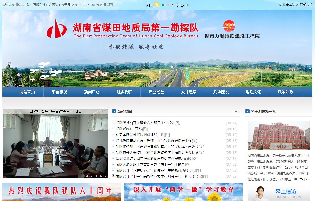 湖南省煤田地质局第一勘探队前身为煤炭工业部华北煤田地质总局第140勘探队,1954年成立于河北邯郸峰峰矿区,1955年搬迁至山西彭城一带,1959年调往湖南湘潭,1964年迁址湖南耒阳,现位于耒阳市五一中路153号,占地面积125亩。现有职工1100人,地质、探矿、物探、测量等各类高中级专业技术人员80人。拥有动力头、石油钻机等地勘设备100台套,是一支从事矿产勘查、钻探施工、工程勘察、基础工程、测量测绘、地灾勘查设计施工、机械制造加工、汽车修理与销售、商贸服务等多种业务的综合性地勘队伍。业务范围及资质等级。地质勘查:区域地质调查甲级;液体矿产勘查甲级;气体矿产勘查甲级;固体矿产勘查甲级; 水文地质、工程地质、环境地质调查甲级;地质钻探甲级;地质灾害治理工程施工甲级;地质灾害治理工程设计甲级;地质灾害治理工程勘查甲级。测绘资质乙级:工程测量、控制测量、地形测量、规划测量、建筑工程测量、变形形变与精密测量、市政工程测量、线路与桥隧测量、矿山测量;不动产测绘、地籍测绘。拥有安全生产许可证、质量和职业健康安全体系认证证书。自建队以来,始终以地质找矿和地质勘探为主业。到目前为止,在省内外共计完成钻探进尺130万米、各类地质测量5万平方公里、槽探80万立方米,并进行了大量的物探工作,独立提交煤田地质报告250余件,累计探明煤炭储量170亿吨。《马田矿区新星井田详查报告》、《东湖水文地质报告》获全国优质地质报告;《湘永矿区马家湾井田详查(最终)报告》获湖南省优良报告,同时获中国煤田地质总局第二届新发现煤炭资源奖;《湖南含煤区滑脱构造与找煤研究》和《应用超声波成相测井探测地层产状、解释地质构造》获湖南省科技进步三等奖;《湖南省耒阳市白沙矿区坦里深部煤矿普查地质报告》荣获湖南省“十五”期间重大地质勘查成果二等奖。主要荣誉称号:1978年2月被煤炭工业部命名为“大庆式企业”;1993年5月被煤炭工业部评为“煤炭工业地质勘探先进单位”;2007年10月被国土资源部评为“全国地质勘查行业先进集体”;2008年2月被湖南省总工会评为“模范职工之家”;2011年11月被湖南省纪委、省委组织部、省监察厅、省总工会等12家单位联合授予“湖南省厂(校、院)务公开民主管理先进单位”;荣获2008届和2014届“湖南省文明单位”;2012年12月被中华全国总工会评为“全国模范职工之家”。