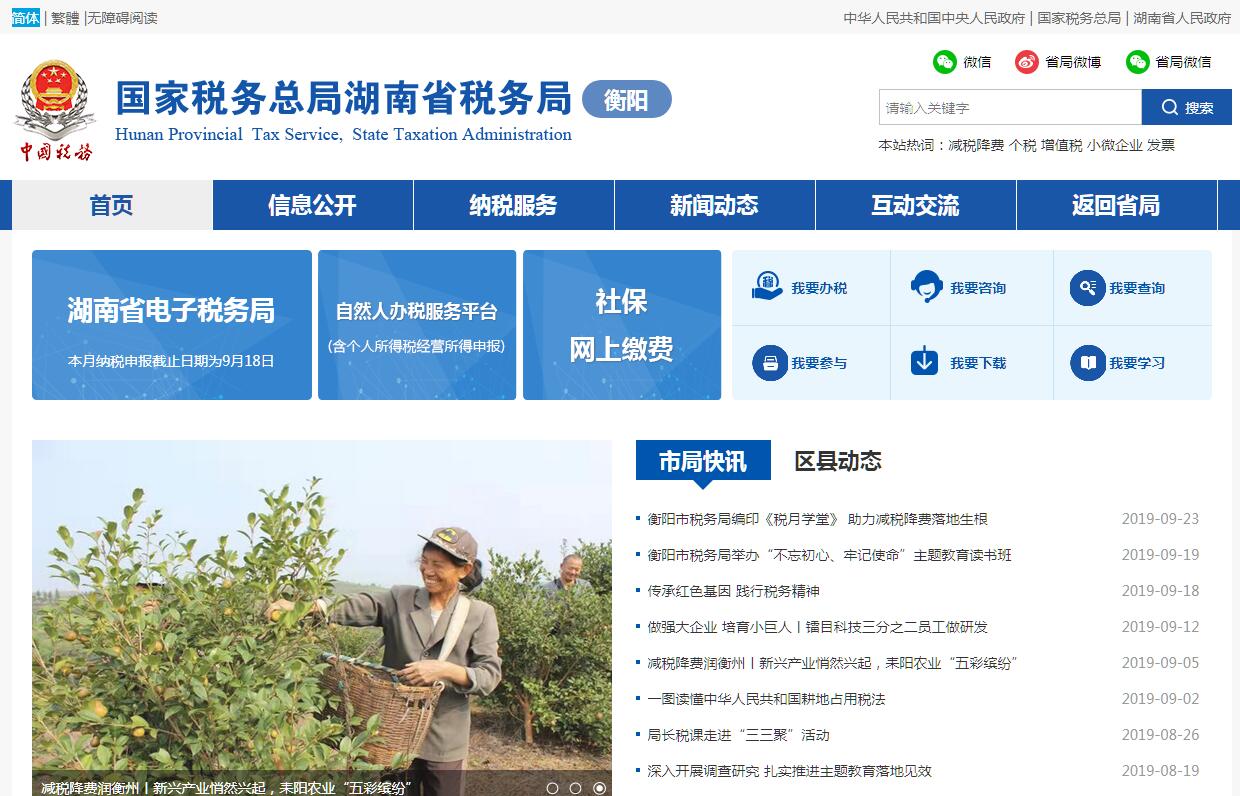 国家税务总局衡阳市税务局的主要职责是:(一)负责贯彻执行党的路线、方针、政策,加强党的全面领导,履行全面从严治党责任,负责党的建设和思想政治建设工作。(二)负责贯彻执行税收、社会保险费和有关非税收入法律、法规、规章和规范性文件,研究制定具体实施办法。组织落实国家规定的税收优惠政策。(三)负责研究拟定本系统税收、社会保险费和有关非税收入中长期规划,参与拟定税收、社会保险费和有关非税收入预算目标并依法组织实施。负责本系统税收、社会保险费和有关非税收入的会统核算工作。组织开展收入分析预测。(四)负责开展税收经济分析和税收政策效应分析,为国家税务总局湖南省税务局和市委、市政府提供决策参考。(五)负责所辖区域内各项税收、社会保险费和有关非税收入征收管理。组织实施税(费)源监控和风险管理,加强重点税源企业和自然人税收管理。(六)负责组织实施本系统税收、社会保险费和有关非税收入服务体系建设。组织开展纳税服务、税收宣传工作,保护纳税人、缴费人合法权益。承担涉及税收、社会保险费和有关非税收入的行政处罚听证、行政复议和行政诉讼事项。(七)负责所辖区域内国际税收和进出口税收管理工作,组织反避税调查和出口退税事项办理。(八)负责组织实施所辖区域内税务稽查和社会保险费、有关非税收入检查工作。(九)负责增值税专用发票、普通发票和其他各类发票管理。负责税收、社会保险费和有关非税收入票证管理。(十)负责组织实施本系统各项税收、社会保险费和有关非税收入征管信息化建设和数据治理工作。(十一)负责本系统内部控制机制建设工作,开展对本系统贯彻执行上级部门重大决策及工作部署情况的督查督办,组织实施税收执法督察。(十二)负责本系统基层建设和干部队伍建设工作,开展领导班子和后备干部队伍建设,承担税务人才培养和干部教育培训工作。负责本系统绩效管理和干部考核工作。(十三)负责本系统机构、编制、经费和资产管理工作。(十四)完成国家税务总局湖南省税务局和市委、市政府交办的其他工作。