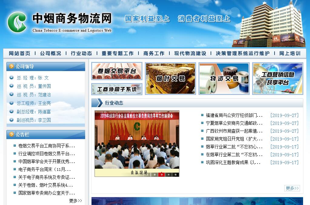 | 网站简介: 中烟商务物流有限责任公司是经国家烟草专卖局、中国烟草总公司批准的有限责任公司,是中国烟草总公司的全资子公司。烟草商务是烟草行业的运行基础,烟草物流是烟草行业的核心业务。中烟商务物流有限责任公司承担着行业电子商务发展规划的实施、商务平台的建设、卷烟工商交易的运行、行业卷烟经营决策管理系统的运行维护和技术支持、行业物流的规划、建设、管理、运行、信息化等方面工作。 |