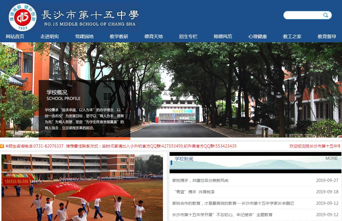 步入长沙市城区中心的侯家塘商业圈,在这个溢彩流光的繁华地段,毗邻贺龙体育场的黄金码头,有一颗熠熠生辉的璀璨明珠,那就是长沙市第十五中学。她西临芙蓉路,南倚劳动路,东靠梓园路,处于长沙市商业、文体中心区域和交通枢纽位置。学校创办于1922年,迄今已有90年的历史。当年,湖南教育界名宿宾步程、曹典球等人创办“湖南私立明宪女子初级中学”,立“公勇勤朴”校训,行“化民成俗”誓言,以“明德所以亲民,宪章斯能立教”为办学宗旨,奠定了十五中教育的千秋伟业!1945年学校改名为市四女中,1956年定名为长沙市第十五中学。2002年被湖南省教育厅授牌为“湖南省重点中学”,2004年被湖南省教育厅授牌为首批“湖南省示范性普通高级中学”。90年来,十五中学三易其名,五迁其址,为国家培育了五万余名合格毕业生。有以王建国、黄学东、魏炜等为代表的学界巨子,还走出了著名歌唱家李谷一、著名考古学家宋少华、著名经济学家宋敏等一大批名家。学校师资力量雄厚。现有硕士研究生导师1人,国家级骨干教师2人,特级教师1人,高级教师68人,18人取得研究生学历或在读研究生。教师队伍阵容整齐,结构合理,任课教师学历合格率100%,并呈高学历发展趋势。各学科均有中青年骨干教师,有省、市优秀教师20人,高考命题教师1人,8人担任省、市学科专业学会理事和兼职教研员。有国家级普通话测试员2人。学校是湖南省园林式单位。校园面积47000多㎡,生均面积达32㎡,总建筑面积 45000 ㎡,绿化覆盖率达到57%。经过2011年提质改造,旧貌换新颜。如今徜徉在校园,香樟如盖,绿草成茵。亭台轩榭,朝迎旭日;小桥流水,夕送晚霞。整个校园环境宜人,格调高雅,文化气息浓郁。学校设施齐全。有现代一流的教学楼、科学馆、体艺馆。作为湖南省现代教育技术实验学校,拥有符合省级现代教育技术实验学校的各项现代教育技术设备。现有专用的理、化、生仪器室和实验室共12间,科技活动室1间,通用技术教室3间。有全自动录播室、校园电视台演播室,建有校园网。每个教学班配备有整套多媒体设备。学生宿舍设置有卫生间、盥洗间、空调、顶扇,功能设施齐全,通风采光良好。市级A级食堂,设备齐全,干净有序。学校图书馆设施完善,配置规范。图书总藏书量12万余册,人均超过45册。万有文库拥有明宪女中传承下来的古籍藏书16000余册,被资深专家誉为“珍宝之物”,有极高的收藏价值。
