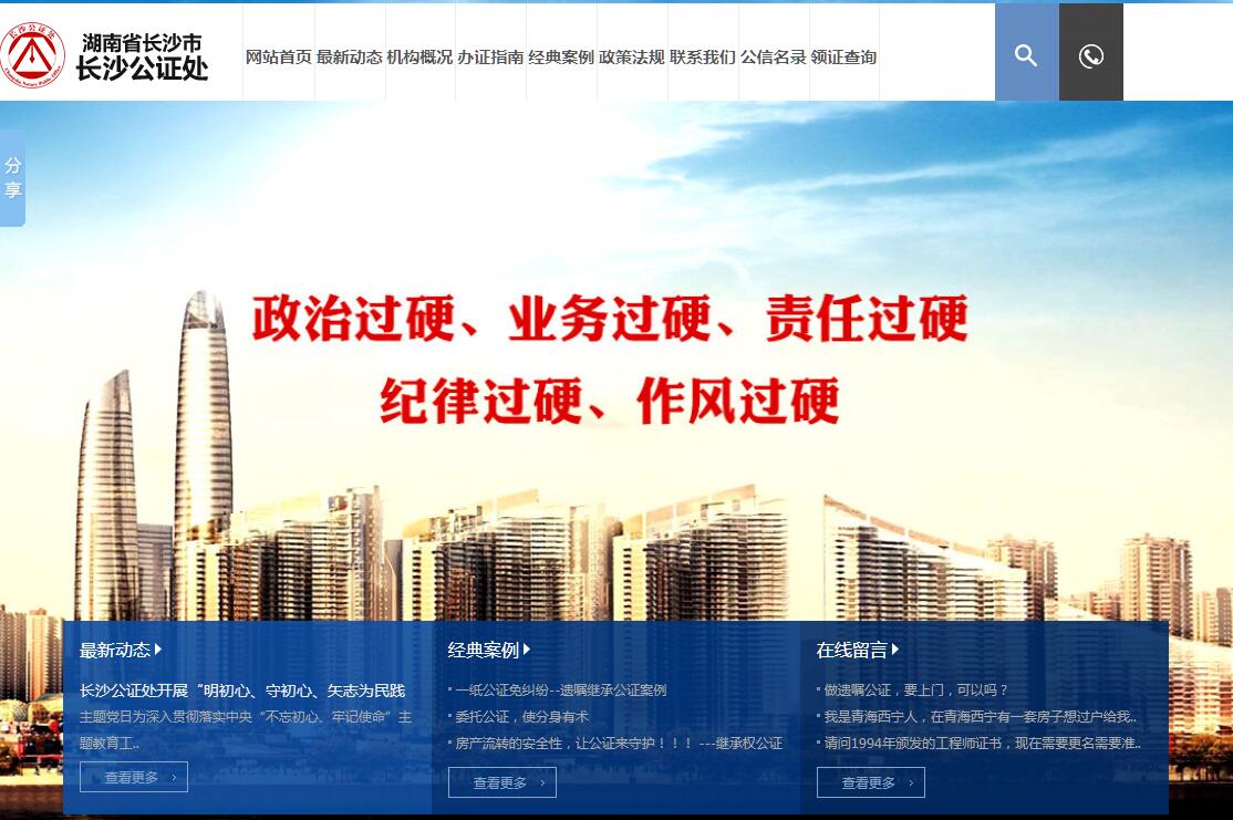 湖南省长沙市长沙公证处(原长沙市公证处)成立于1956年,1959年被撤销,1980年6月恢复重建,同年11月划归市司法局领导。2010年9月,更名为湖南省长沙市长沙公证处。2015年4月,由全额事业单位改制为公益二类事业单位,为独立承担民事责任的事业单位法人,实行自收自支,依法纳税。长沙公证处现有公证人员57人,其中,执业公证员27人;全处人员均具有大专以上学历,其中,具有大学本科学历的39人,具有硕士研究生学历的13人,并配备有英语、法语翻译。长沙公证处是全省唯一一家由司法部、国家工商总局、国家版权局、国家知识产权局共同授牌的知识产权公证服务示范机构,并与多家律所建立知识产权保护战略合作伙伴关系。长沙公证处致力于创建一流的办证设备与环境:2004年,创建官方网站,设立“在线咨询”平台;2008年,在全省率先使用公证信息管理系统,并配备二代身份证识别仪,实现网络信息化办公;2012年,在全省率先使用排队叫号系统,实现智能化办证;2015年,在所有国内公证书添加防伪二维码,并开通支付宝、微信公众号的线上办证平台,成为湖南省独家支付宝办证的公证处;2016年,增设周末及节假日预约办证、网上领证查询等新功能,为当事人提供灵活办证时间;2018年,“放管服”改革开通24项立等可取涉外公证;同时,独立的接待受理大厅、独立遗嘱室、优待室、保全证据室、母婴室等一应俱全。恢复重建三十多年来,长沙公证处全体员工始终以“质量是永恒的主题,服务是永远的追求”为座右铭,以为社会各界提供优质、高效、便捷的公证法律服务为己任,大胆探索、勇于创新,不仅被司法部授予全国首批部级“文明公证处”荣誉称号,还被全国妇联授予“全国巾帼文明岗”称号,被省精神文明委、省妇联授予“文明示范窗口单位”、“湖南省巾帼文明岗”,更多次被省级、市级司法行政系统评为先进单位。主任佘信群被司法部授予“第二届全国十佳公证员”光荣称号,主任助理肖巨被评为第七届“全国优秀公证员”,公证员王燕被评为长沙市十佳法律服务标兵,公证员许杰被评为长沙市窗口单位和服务行业党员服务标兵,赢得社会各界的广泛信赖和好评。