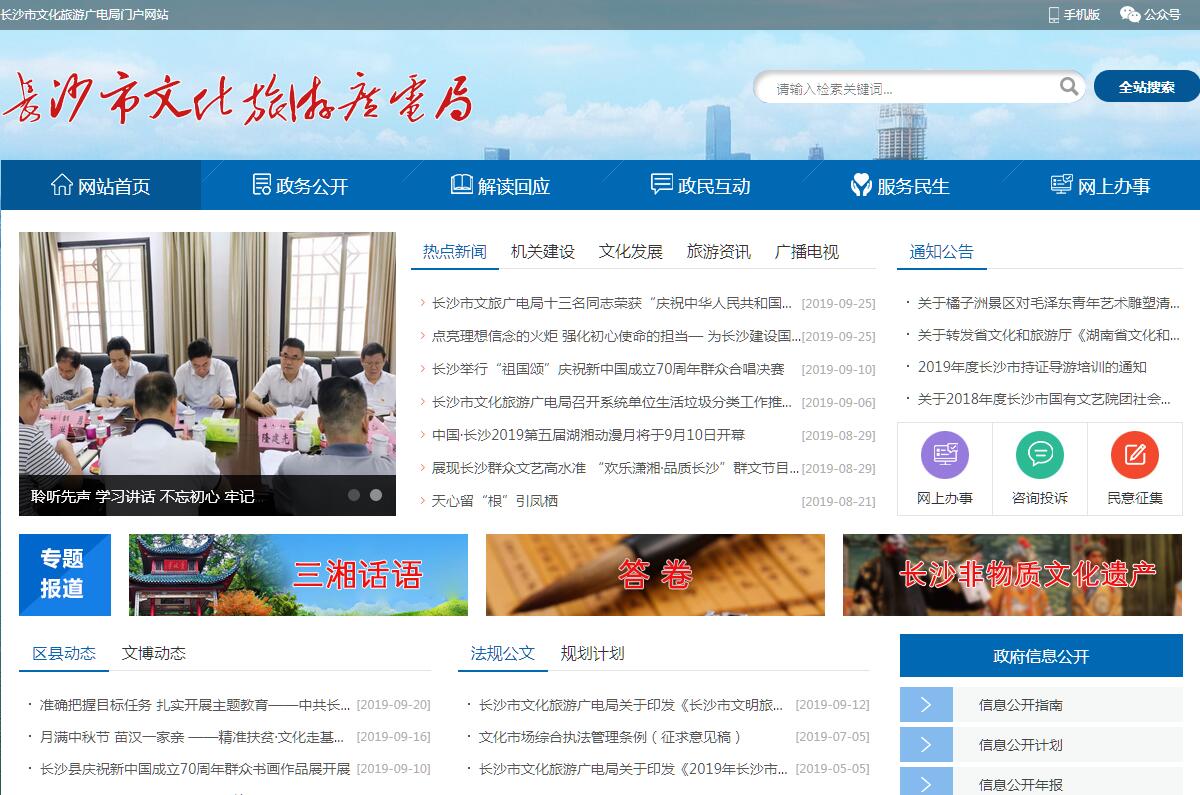 长沙市文化旅游广电局贯彻落实党中央关于文化、旅游和广播电视工作的方针政策和决策部署,全面落实省委、市委关于文化、旅游和广播电视工作的部署要求,在履行职责过程中坚持和加强党对文化、旅游和广播电视工作的集中统一领导。其主要职责是:(一)研究拟订全市文化、旅游、广播电视、网络视听节目服务管理的政策措施,起草文化、旅游和广播电视地方性法规、规章草案。(二)统筹规划全市文化事业、文化产业、旅游业和广播电视业发展,拟订发展规划并组织实施,推进文化和旅游融合发展,推进文化、旅游和广播电视领域体制机制改革。(三)管理全市性重大文化、旅游和广播电视活动,指导全市重点文化、旅游和广播电视设施建设,监督全市重点广播电视设施建设,组织全市文化、旅游和广播电视整体形象宣传推广,促进文化、旅游和广播电视领域产业对外合作和国际市场推广,制定旅游市场开发战略并组织实施,指导、推进全域旅游。(四)指导、管理全市文艺事业,指导艺术创作生产,扶持体现社会主义核心价值观、具有导向性代表性示范性的文艺作品,推动各门类艺术、各艺术品种发展。加强广播电视阵地管理,把握正确的舆论导向和创作导向。(五)负责推进全市文化、旅游和广播电视公共服务体系建设,组织实施广播电视公共服务重大公益工程和公益活动,深入实施文化、旅游和广播电视惠民工程,统筹推进基本公共文化服务标准化、均等化。(六)指导、推进全市文化、旅游和广播电视科技创新发展,推进文化、旅游和广播电视行业信息化、标准化建设。贯彻广播电视行业标准并组织实施和监督检查。(七)负责全市非物质文化遗产保护,推动非物质文化遗产的保护、传承、普及、弘扬和振兴。(八)组织实施文化、旅游和广播电视业资源普查、挖掘、保护和利用工作,促进文化、旅游和广播电视领域产业发展。(九)指导全市文化、旅游和广播电视领域市场发展,对文化、旅游和广播电视领域市场经营进行行业监管,推进全市文化、旅游和广播电视行业信用体系建设,依法规范文化、旅游和广播电视领域市场。推进广电网与电信网、互联网三网融合。(十)负责对各类广播电视机构进行业务指导和行业监管,会同有关部门对网络视听节目服务机构进行管理。指导电视剧行业发展和电视剧创作生产。监督管理、审查广播电视节目、网络视听节目的内容和质量。指导、监管广播电视广告播放。指导、协调广播电视全市性重大宣传活动,指导实施广播电视节目评价工作。(十一)负责对广播电视节目传输覆盖、监测和安全播出进行监管,指导、推进应急广播体系建设。指导、协调广播电视系统安全和保卫工作。(十二)负责管理全市文化市场综合执法,指导监督全市文化、文物、广播电视、旅游、出版、版权、印刷、电影等市场领域行政执法,组织查处全市文化、文物、广播电视、旅游、出版、版权、印刷、电影等市场领域违法行为,维护市场秩序。(十三)指导全市文化、旅游和广播电视对外及对港澳台交流、合作和宣传、推广工作,组织大型文化、旅游和广播电视对外及对港澳台交流活动,推动长沙特色文化走出去。(十四)管理全市文物、博物馆事业,指导开展文物的保护、管理、利用工作。(十五)负责文化市场、旅游行业、有关文化娱乐场所和文博、艺术等公众聚集场所、文化艺术经营活动安全监督管理。(十六)指导全市文化、旅游和广播电视、网络视听行业人才队伍建设。(十七)完成市委、市政府交办的其他任务。
