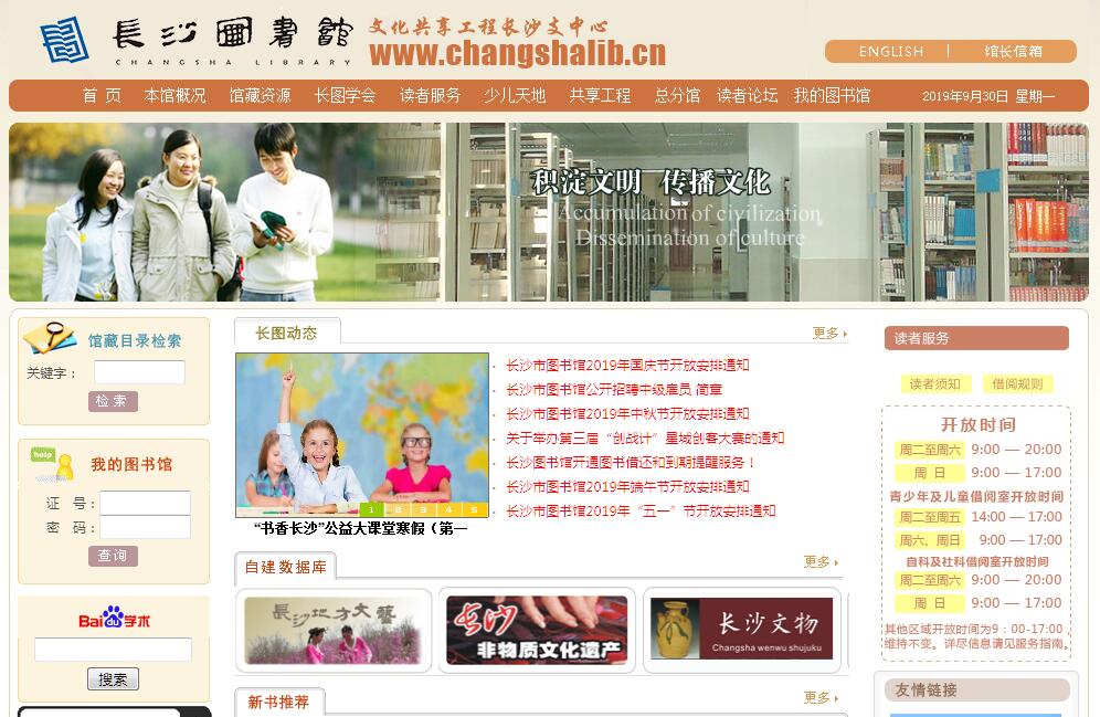 长沙市图书馆是地市级的综合性公共图书馆,成立于1960年,老馆馆址定王台是湖南图书馆事业的发祥地。新馆座落于新河三角洲长沙滨江文化园内,于2015年底全面开放,总建筑面积3.2万平方米,共5层,规划藏书量200万册,每天可接待读者10000余人次。图书馆外形设计独具创意,如同巨大的顽石屹立于湘江和浏阳河的汇合处,象征着开放、创新的“湖湘精神”和刚强、勇敢的“湖南性格”。图书馆外墙设计方案,取材于《荀子·劝学篇》,展现了图书馆的文化底蕴。馆内主要设置有社科文献借阅室、自科文献借阅室、报刊借阅室、儿童借阅室、青少年借阅室、视障文献借阅室、电子文献阅览室、多元文化馆、长沙人文馆、多功能报告厅、新三角创客空间、24小时自助图书馆、咖啡书吧、乐之书店、阅读花园等二十多个功能区域。全馆现有职工106人,实行免费开放。目前已在全市建立分馆100家,24小时自助图书馆7个,配备了流动图书车,设置流动服务点86个,实现了总分馆之间一卡“通借通还”借阅服务。长沙图书馆以打造城市“文化综合体”为目标,常年举办讲座、培训、展览、阅读推广等文化活动。致力建设成为长沙文献信息资源服务中心、全民阅读终身教育中心、区域图书馆网络中心、文化学术交流中心。
