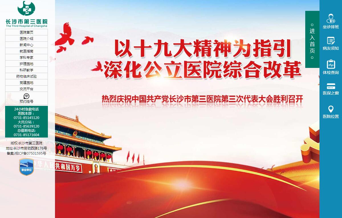 1923年,长沙市第三医院的前身德生医院由德籍医生安德生在小型诊所的基础上扩建而成,定址学院街;1952年,医院改名为长沙市工人医院,定新址于劳动路磨子山;1958年,医院正式更名为长沙市第三医院。经过近90多年的励精图治与开创发展,医院现已成为一所集医疗、教学、科研、保健、预防于一体的大型三级甲等综合医院,是国家执业医师实践技能资格考试基地,国家临床药物试验认定机构,国家自然科学基金申报依托单位,是中南大学湘雅医学院长沙三临床学院,南华大学、湖南中医药大学研究生培养基地,湖南省普通高等院校优秀实习教学基地,湖南省住院医师规范化培训协同单位、湖南省助理全科医生培训基地。医院占地面积58亩,建筑面积80305㎡ ,开放病床1100张,在职职工1260余人,其中高级职称270余人,博士、硕士研究生260余人,硕士研究生导师15人,兼职(副)教授51人。开设临床医技科室46个,拥有湖南省重点建设专科1个(临床药学),湖南省市州级重点建设专科2个(骨科、呼吸内科),长沙市医学重点学科1个(骨科学科),长沙市医学重点建设学科1个(老年医学学科),长沙市医学重点专科6个(临床药学、呼吸内科、老年医学科、心血管内科、内分泌代谢科、泌尿外科)。是长沙市医学会心血管病专业委员会、呼吸病专业委员会、骨科专业委员会、临床药学专业委员会主委挂靠单位,是长沙市消毒供应质量控制中心、长沙市临床用药质量控制中心、长沙市肿瘤化疗质量控制中心挂靠单位,是长沙市3D打印医学应用研究所、长沙市抗菌药物临床应用研究所、长沙市血管病防治研究所建设单位、长沙市抗感染药物工程技术研究中心、湖南省感染性疾病合理用药技术基地、湖南省老年骨与关节疾病(数字骨科)临床医疗示范基地挂靠医院,湖南省首批中国心衰中心。医院门诊大楼、急救中心建于2003年,外科医技综合楼于2007年投入使用,开放洁净手术间10间,高标准配置建设有中心ICU、临床检验中心。二十层内科大楼于2015年初投入使用,新的内科医疗区开设病床670余张,建筑面积38000㎡。医院拥有万元以上设备700余件,如GE1.5T核磁共振、GE16排螺旋CT、西门子40排双螺旋CT、菲利浦医用血管造影X线系统、日立数字化X线摄影系统、GE数字四维彩超、GE心脏彩超、东芝全自动生化仪等一大批高档精密诊疗设备,使临床诊断手段进一步优化。医院先后荣获全国百姓放心示范医院、全国执行物价政策较好的十家单位之一、湖南省文明窗口示范单位、长沙市文明单位、长沙市医德医风示范医院、长沙市公用事业单位推行办事公开制度示范单位、市卫生系统党风廉政建设责任制先进单位等荣誉称号。展望未来,医院将以内镜微创技术、介入技术、基因检测技术为重点学科发展方向,走具有三医特色的品牌发展道路,实现医疗质量、服务水平、运营效率、社会满意度显著提升,为医药卫生事业的发展和人民群众的身体健康做出应有贡献。