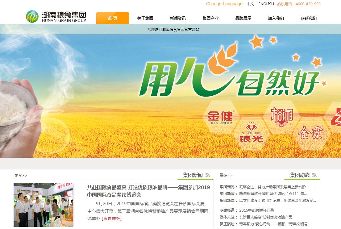 湖南粮食集团是经湖南省政府批准,整合有关优势资源成立的国有大型综合性粮食企业,主要业务有品种研发、种子繁育、粮油收储、粮油加工、中转物流、市场交易、期货交割、经营贸易、电子商务、生态板业等。拥有12个粮食收购储备公司,仓(罐)容量220万吨;拥有5个粮油加工企业,年加工能力近200万吨;拥有长沙国家粮油交易中心,交易额近100亿元;拥有2条铁路专用线,6个两千吨级泊位,年货物吞吐能力560万吨;拥有湖南粮食饲料现货交易市场,年交易额15亿元;拥有全国规模最大的早籼稻期货交割库;拥有粮食集团、金健米业、裕湘食品和银光粮油4个农业产业化国家级重点龙头企业,拥有金霞粮食、金山粮油、金牛米业、中意食品等农业产业化省级重点龙头企业,拥有“金健”、“金霞”、“裕湘” 和“银光”、“中意”5大品牌。产品向米、面、油、奶、粉、药、休闲食品等多元化发展,营销网络立足湖南,布局全国,辐射欧洲、美国、日韩、东南亚等地。集团以习近平新时代中国特色社会主义思想为指导,以确保粮食安全为己任,以转型发展为重点,以效益提升为目标,按照“大粮食、大品牌、大市场、大物流、大金融”的整体发展思路,着力推动“国际化、专业化、资本化”的战略布局,构建“一链四业多园区”的产业格局,实施科技创新“一核带动”、着力实体经营与资本运营“两轮驱动”、强化文化引领力、人才支撑力和机制保障力“三力推动”、坚持粮食产业、食品工业、生态农业、现代服务业“四业联动”的战略举措,把准“重组、整合、创新、提质、增效”的经营方针,立足粮食主业,突出产业延伸,拓展辅业支撑,深化企业改革,发展混合所有制,推动集团整体上市,致力打造最具品牌影响力和核心竞争力的世界级食品投资控股集团。