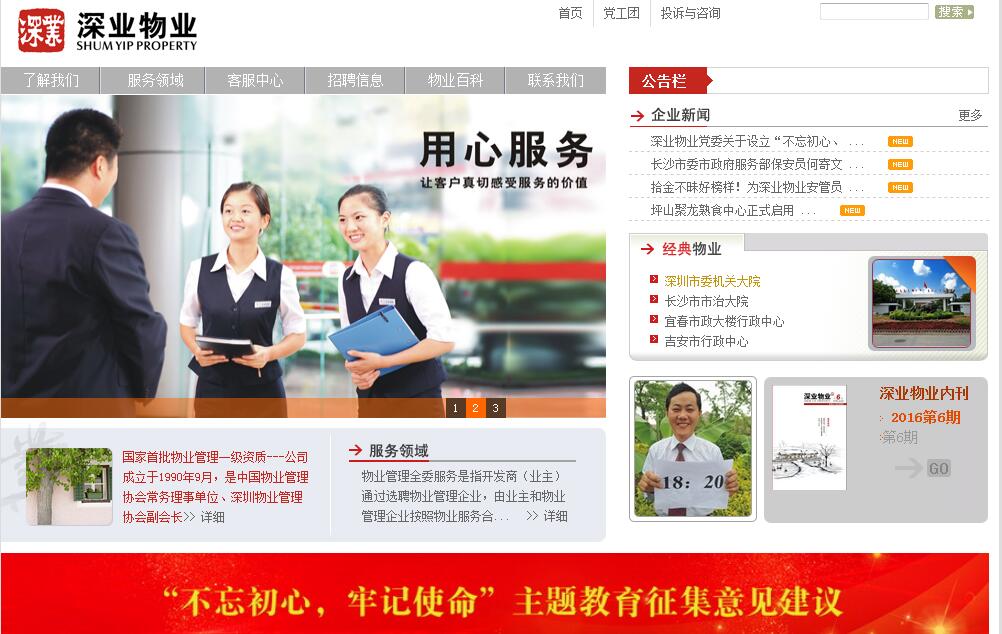 深业集团(深圳)物业管理有限公司(简称深业物业公司)是深圳市政府驻港窗口企业——深业集团(香港联交所:深圳控股)属下的全资子公司。公司成立于1990年9月,是中国物业管理协会常务理事单位、深圳物业管理协会副会长单位、国家首批物业管理一级资质企业。公司本部设在深圳,在深圳地区设立八大管理区,在外地设立7个分公司,下设电梯维保、绿化工程、环境消杀等多个专业分公司。公司主营业务是“物业服务“,管理项目80余个,分布于深圳、东莞、广州、佛山、河源、长沙、宜春、南京、丹阳、马鞍山等大中城市,涵盖政府机关、写字楼、住宅小区、别墅、工业园区等多种物业类型,其中有多个项目获“全国物业管理优秀示范小区(大厦)”称号。公司推行卓越绩效管理体系,坚持“优质服务、绿色环境、安全生产、持续改进”的质量方针,致力提升客户的生活品质、工作品质,建立以ISO9000质量管理体系、GB/T24000环境管理体系和GB/T28000职业健康安全管理体系为支撑、员工行为体系为保障、信息网络体系为手段、CIS企业品牌体系为外延的现代企业管理架构。公司以“做最具价值的城市空间服务商”为愿景,秉承“以专业服务城市、以智慧创造价值”的使命,倡导“创新卓越、和谐共享、阳光坦诚、勤勉尽责”的核心价值观,追求个人、企业、社会的高度和谐与共同发展。近年来,公司以优质的服务、规范化的管理获得业主与行业的肯定,先后获得深圳市物业管理先进单位、深圳市首届遵守劳动法模范企业、中国物业服务行业最具社会责任品牌50强、中国物业行业最具综合实力品牌企业、深圳第七届“深圳知名品牌”企业、2009年度深圳物业管理业主满意度指数(抽样单位)领先企业,2011年中国优秀服务品牌企业、中国物业服务企业综合实力百强企业、2013年全国物业服务企业综合实力200强企业、2013年度深圳综合实力三十强企业、2014年广东省最佳物业管理10强,2015年全国物业服务企业综合实力100强企业、2015年全国物业服务企业“办公物业”特色企业、企业信用评价AAA级信用企业、2015年度深圳综合实力五十强企业等荣誉,我司内刊还获得深圳市十优企业内刊、深圳市出版业企业报刊精英奖。展望未来,公司将一如既往地以创造和谐社区、和谐社会的目标为己任,为推动中国物业管理行业的发展与进步而不懈努力!