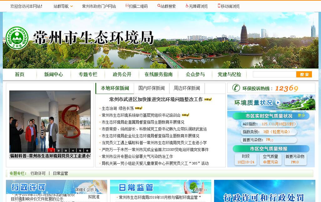 常州市生态环境局主要职责:(一)落实执行生态环境基本制度。贯彻落实国家、省生态环境的方针政策和法律法规。会同有关部门拟订全市生态环境政策、规划并组织实施,起草生态环境地方性法规和规章草案。会同有关部门编制并监督实施重点区域、流域、饮用水水源地生态环境规划和水功能区划,组织实施各类生态环境标准、基准和技术规范。(二)负责组织指导、协调全市生态文明建设工作,组织编制生态文明建设规划,开展生态文明建设考核和评价。(三)负责重大生态环境问题的统筹协调和监督管理。牵头协调全市范围内重特大环境污染事故和生态破坏事件的调查处理,指导协调辖市(区)政府重特大突发生态环境事件的应急处置、预警工作,牵头指导实施生态环境损害赔偿制度,协调解决有关跨区域环境污染纠纷,统筹协调全市重点区域、流域生态环境保护工作。(四)负责落实减排目标任务。组织实施地方污染物排放总量控制、排污许可证制度并监督管理,确定大气、水等纳污能力,提出实施总量控制的污染物名称和控制指标,组织制定和实施污染物减排计划,监督检查各辖市(区)污染物减排任务完成情况,实施生态环境保护目标责任制。(五)负责提出生态环境领域固定资产投资规模和方向、市财政性资金安排意见。按规定权限,审批、核准全市规划内和年度计划规模内固定资产投资项目,配合有关部门做好组织实施和监督工作。参与指导和推动循环经济和生态环保产业发展。(六)负责环境污染防治的监督管理。贯彻执行国家、省关于大气、水、土壤、噪声、光、恶臭、固体废物、化学品、机动车等污染防治管理制度。指导协调和监督农村生态环境保护,会同有关部门监督管理饮用水水源地生态环境保护工作,组织指导城乡环境综合整治工作,监督指导农业面源污染治理工作。监督指导区域大气环境保护工作,组织实施区域大气污染联防联控协作机制。(七)贯彻落实省委、省政府和市委、市政府关于太湖水污染防治工作的各项政策和决策部署。协调解决太湖水污染防治工作的重大问题。拟订并组织实施全市太湖水污染防治工作计划,参与拟订有关太湖水污染防治规划。组织实施国家和省有关太湖流域水环境综合治理方案。根据市政府授权,对市各有关部门和各辖市(区)人民政府实施太湖水环境保护和治理工作进行监督检查。统筹协调和监督全市水生态环境管理工作。(八)指导协调和监督生态保护修复工作。拟订生态保护规划,监督对生态环境有影响的自然资源开发利用活动、重要生态环境建设和生态破坏恢复工作。组织实施各类自然保护地生态环境监督管理工作。监督野生动植物保护、湿地生态环境保护等工作。监督生物技术环境安全,牵头生物物种(含生物遗传资源)工作,组织协调生物多样性保护工作,参与生态保护补偿工作。(九)负责核与辐射安全的监督管理。对核技术应用、电磁辐射和伴有放射性矿产资源开发利用中的污染防治实施统一监督管理,会同有关部门负责放射性物质运输的监督管理,参与核事故应急处理,负责辐射环境事故应急处理工作,负责废旧放射源和放射性废物的管理,组织辐射环境监测。配合上级生态环境部门对市内核设施安全、核材料管制和民用核安全设备实施监督管理。(十)负责生态环境准入的监督管理。按规定组织审查重大经济和技术政策、发展规划以及重大经济开发计划的环境影响评价文件,按规定权限审批或审查辖区内开发建设区域、规划、项目环境影响评价文件。组织实施生态环境准入清单。(十一)负责生态环境监测工作。组织实施生态环境监测制度、规范和标准,落实执行生态环境监测质量管理制度。组织实施市级以下生态环境质量监测,组织实施污染源监督性监测、温室气体减排监测、应急监测、执法监测。负责全市生态环境监测网的建设和管理。(十二)统一负责生态环境监督执法。指导全市生态环境保护综合执法工作,组织开展全市生态环境保护执法检查活动,查处生态环境违法问题。组织拟订重特大突发生态环境事件和生态破坏事件的应急预案,指导调查处理工作。(十三)负责生态环境信息化工作。建设和管理生态环境信息网。实行生态环境质量公告制度,统一发布全市生态环境综合性报告和重大生态环境信息。(十四)组织指导和协调生态环境宣传教育工作。制定并组织实施生态环境保护宣传教育纲要,推动社会组织和公众参与生态环境保护。开展生态环境科技工作,组织生态环境重大科学研究和技术工程示范,推动生态环境技术管理体系建设。(十五)开展应对气候变化和生态环境对外合作交流工作。组织实施中央、省应对气候变化及温室气体减排的战略、规划和政策。归口管理全市生态环境国际合作和利用外资项目,组织协调市内有关生态环境国际条约的履约工作。(十六)完成市委、市政府交办的其他任务。