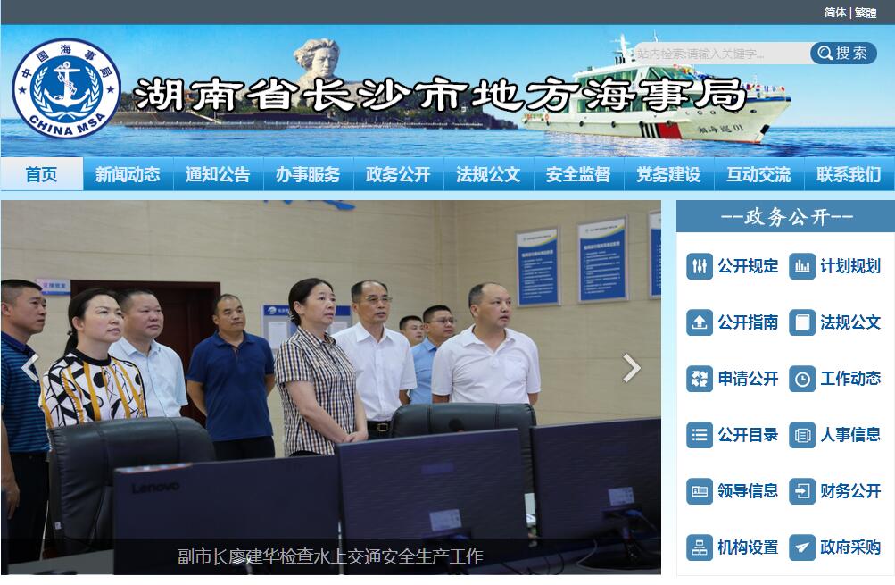 湖南省长沙市地方海事局(加挂长沙市航务管理局、长沙市船舶检验局牌子)为正县级参公管理事业单位,设有12个内设机构、6个海事处(派出机构),按章程设置纪检监察、机关党委、老干办、工会、团委。人员编制182名,编外合同制人员110人、离退休人员100人;局党委设10个党支部、党员179名。主要承担以下十项职能职责:(一)承担水上交通安全监管职责。负责全市12条河流、573公里通航水域水上通航环境与通航秩序管理;组织实施水上巡逻、船舶安全检查和水上交通管制;审核水上水下施工安全技术状况;划定锚地和禁航水域,发布航行通告和警告;调查处理水上交通事故。(二)承担水路运输市场管理职责。负责全市水路运输及运输服务业市场、港口装卸搬运市场、砂石市场、船舶交易建造市场的管理;对辖区37家水运企业、25家水运服务企业及营运船舶实施行政管理,审核发放水路运输许可证和船舶营运证,监督市场秩序;组织协调水路战备运输和防汛抢险运输工作。(三)承担船舶、船员管理职责。负责全市船舶登记和船舶抵押贷款审核;负责四等以下船员和其他从业人员适任资格培训、评估、考试和发证管理;负责辖区内船舶、水上设施、船用产品的营运检验,船舶图纸审核及建造技术审核。目前,全市有各类船舶1100艘,59.5万余总吨位,其中散货船(含砂石运输船)525艘、集装箱运输船14艘、客渡船和旅游客船185艘、其它船舶376艘;船舶轮驾及相关从业人员1.4万人。(四)承担港口、码头管理职责。负责对长沙港霞凝、新康、铜官、客运港区等4大客货港区的港口码头建设和经营实施行政管理;对全市港口岸线、水域使用权进行审核;对7个港口作业区、20个客货码头、6个砂石基地码头实施安全监管;调查处理港口生产、设备事故。(五)承担内河航道管理职责。负责湘江、浏阳河、捞刀河等12条内河航道的建设、养护和管理;组织实施等级航道建设和维护性工程;设置和维护除军用航标、渔业航标以外的航标和助航标志,管理和发布航道公告;监督航道水域施工。目前,全市共有航道通航里程573公里,其中湘江76公里为三级航道,浏阳河下游54公里为六级航道、捞刀河下游12公里为七级航道,其余均为等级外航道。(六)承担渡口渡船管理职责。负责对全市63道渡口、81艘渡船、150名渡工和签单员进行管理,牵头组织对渡口、渡船进行提质改造,对渡运从业人员进行专业培训、安全教育和资质许可。2016年全市渡运人数150万人次、渡运机动车辆12万台次。(七)承担枢纽通航管理职责。负责湘江枢纽通航调度管理,受理船舶的过闸申请,编排船舶过闸次序,维护过闸安全,管理待闸锚地和禁航水域。湘江枢纽从2012年10月试通航以来至2016年底,累计调度4.86万闸次,通过船舶28.5万艘次,运载货物41000万吨。(八)承担船舶防污染管理职责。负责船舶防污染监督管理,防止船舶污染水域环境,组织实施船舶防污染提质改造,监督船舶垃圾、油污等污染物的回收工作,处理船舶污染事故。(九)承担水上应急救援职责。制定并组织实施水上搜救应急预案,负责发布水运预警信息,组织协调全市通航水域重大水上搜救、沉船沉物打捞、船舶防抗灾害性天气、水域大面积污染的应急处置。(十)承担非通航水域旅游船舶安全监管职责。负责对公园、水库、湖泊、漂流场所等非通航水域的旅游船舶及相关从业人员实施安全监管。