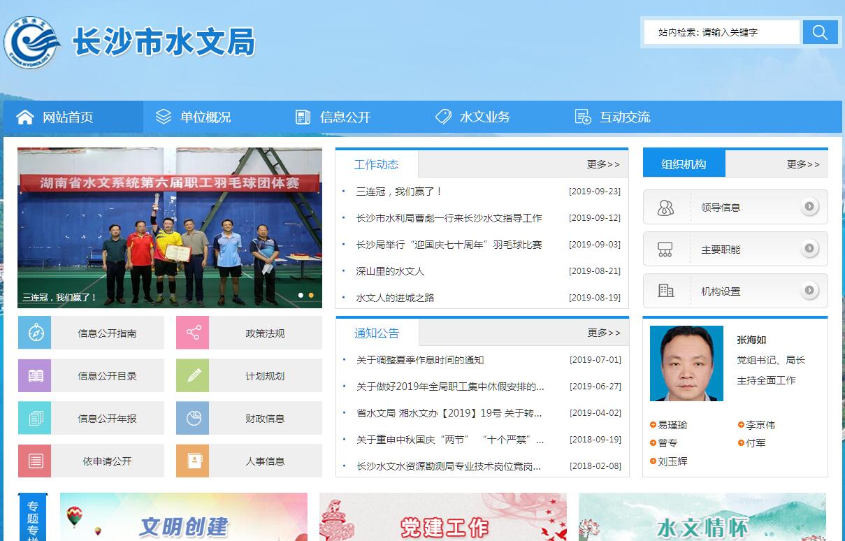 长沙水文水资源勘测局于1992年设立,2007年应市政府要求,经省水利厅同意加挂市水文局牌子。从2010年7月份起,局机关参照公务员法管理,内设办公室、计划财务科、组织人事科、水情科、水资源科(长沙水环境监测分中心)、监测科、技术服务科等七个职能科室。局下辖长沙水文测区管理委员会、浏阳市水文局、宁乡县水文局、长沙水文站。并在全市范围内设有10个水文(位)站、65个委托雨量站、2个蒸发站、2个泥沙站、2个移动土壤墒情站、18个水质监测断面。我局现有在职职工70人,退休职工30人。在职职工中研究生学历3人,专科以上学历49人。工程师等中级职称19人,高级工程师 5人。市级劳模1名,全国水利技术能手2名,湖南省青年岗位能手1名。近年来,我局水文服务成效明显。积极为防汛抗旱、水资源管理和饮用水安全、长沙“两型城市”建设提供了水文服务和技术支撑;管理工作日益精细。测站管理有新变化,水资源管理有新突破,档案管理上新台阶,财务管理有新成效;发展步伐逐步加快。职工队伍素质得到有效提升,基础设施建设步伐加快,水文科研取得新成果,党建、文明创建和行业宣传力度加大。扎实有效的工作,得到了各级领导和社会各界的一致认同,我局先后获评 “湖南省文明单位”、“湖南省直模范职工之家”、“长沙市文明标兵单位”、“市文明卫生单位”、“市安全文明单位”、“湖南省水利系统文明单位”,还多次被授予“市防汛抗旱先进集体”称号。双江口水文站荣获“全国文明测站”,螺岭桥水文站荣获“省直青年文明号”,长沙水文站荣获“湖南省水利系统文明单位”、“市直共产党员示范岗”等荣誉称号。浏阳市水文局、宁乡县水文局多次被当地党委政府授予“防汛抗旱先进集体”。我局主要职责是担负长沙市辖区内一江四河(湘江、浏阳河、捞刀河、沩水河、靳江河)水文信息的收集、处理与分析,发布重要水情预警预报,参与防洪调度;负责水文资料的收集、汇总、审定、裁决,组织编制防洪影响评价报告;承担全市范围内水文水资源监测、调查、分析计算与评价,编制水资源公报;承担水资源保护规划的编制和水功能区的划分,审核水域纳污能力,发布水质公报;协助水行政主管部门管理和保护水资源。参与编制区域水长期供求计划、水量分配方案,参与实施取水许可、水资源费征收制度和有关国民经济发展规划、城乡规划及重大建设项目的水资源论证工作;负责对水域排污总量的监控,水土流失监测、区域或工程项目水土保持方案的编制,以及工程水文计算所需水文资料与成果的审定;负责全市水文水资源监测站网的布局与规划、建设和调整工作。为市防汛抗旱指挥部重要成员单位之一。