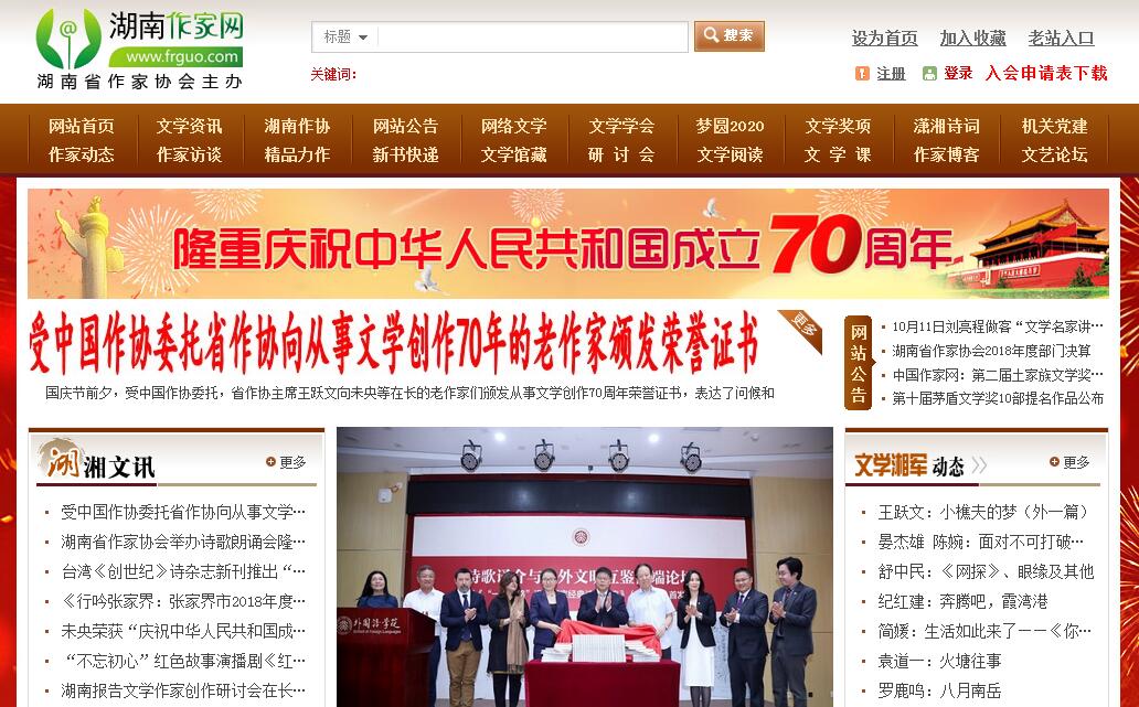 湖南作家网由湖南省作家协会主办。湖南省作家协会是中共湖南省委领导的、由湖南省各民族作家、文学工作者自愿结合的专业性人民团体;是党和政府联系湖南省广大作家和文学工作者的桥梁和纽带,是繁荣文学事业、加强先进文化建设和精神文明建设的重要力量。湖南省作家协会为中国作家协会和湖南省文学艺术界联合会团体会员。其主要的任务有以下几方面:一是组织全省作家、文学工作者学习马克思列宁主义、毛泽东思想、邓小平理论和“三个代表”重要思想,学习党的方针政策,学习文学业务和科学文化知识,努力提高文学队伍的思想业务素质。二是坚持文学创作的正确方向,支持、鼓励、帮助作家深入生活,深入群众,汲取营养,丰富创作。三是加强文学理论研究和文学评论工作,提倡和鼓励不同观点和学派的自由讨论,开展科学的文学批评。四是发现和培养文学创作、评论、编辑、翻译的新生力量,加强作家培训,发展和壮大全省文学创作队伍。五是办好本会所属的报纸、杂志和文化产业,努力实现社会效益和经济效益的同步发展。六是高举爱国主义旗帜,加强同海内外华人作家的联系和交流;积极组织和推荐会员参加国际文学活动,增进同世界各国作家的友谊。七是依据宪法和法律的规定,维护会员的民主权利和合法利益,保障会员的合法权益不受侵犯,保障会员从事正当文学活动的自由。八是加强与社会各界的联系。努力办好作家福利事业,设立文学创作奖励基金,建立有利于作家创作的相关机制,为会员从事创作和其他文学活动创造良好的环境和氛围。九是对优秀的文学创作成果和文学人才,给予表彰和奖励。