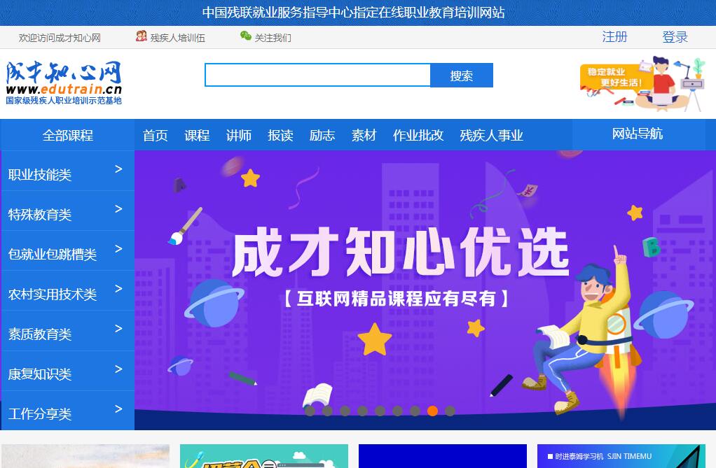 | 网站简介: 成才知心教育网(www.edutrain.cn)领先的综合性远程教育培训服务平台。是中国残疾人联合会指定远程职业教育培训网站,国家级残疾人职业培训示范基地。这是一个集职业培训、就业、创业、分享、帮扶、关怀于一体的平台。这是一座帮助贫困人群、残障人士、求学者可持续性发展的战略桥梁。成才知心教育网聘请了教授、高级讲师、医师等教师任教。这些老师来自:湖南师大、湖南电大、国家级残疾人职业培训基地、特教学校、医院、一线设计师、盲人按摩技师、手工艺技师、校长、总经理等实战精英。目前平台服务用户数量已累计超过万余人。为了进一步保障了贫困人群、残障人士受教育权利,帮助他们全面发展和更好融入社会,解决贫困人群、残障人士最直接、最现实的学习难的问题(交通原因不能参加集中面授的残疾人、重度残疾人培训愿望、残疾人各种技能培训后的继续升造、已就业残疾人不能集中参加培训等)平台为他们提供了公益性的知识援助与就创业帮扶。 |