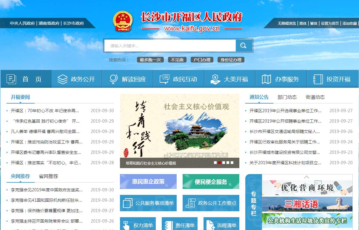 | 网站简介: 开福区,隶属于湖南省长沙市,位于长沙市主城区北部,是长沙市内五区之一。开福区东与长沙县、芙蓉区接界,西与岳麓区毗连,北与望城区相邻,南与天心区相接,下辖16个街道,土地总面积188平方公里,其中建城区面积65平方公里,耕地面积3.307千公顷。截至2017年底,户籍人口48.8万人,其中非农业人口44.69万人。开福区因千年古刹开福寺而得名,是“楚汉名城”和湖湘文化的重要发祥地,也是中国四大名绣之一湘绣的发源地,拥有开福寺、潮宗古街、湖南省博物馆、长沙市博物馆、沙坪湘绣博物馆、世界之窗、海底世界等旅游景点。是国家知识产权强县工程试点县。开福区是国家长株潭城市群“两型社会”建设试点的重要区域,也是长沙推进“大城北”战略的核心区域,2017年,全区实现地区生产总值920.26亿元,同比增长8.8%,地方财政总收入147.12亿元,同比增长12.2%。 |