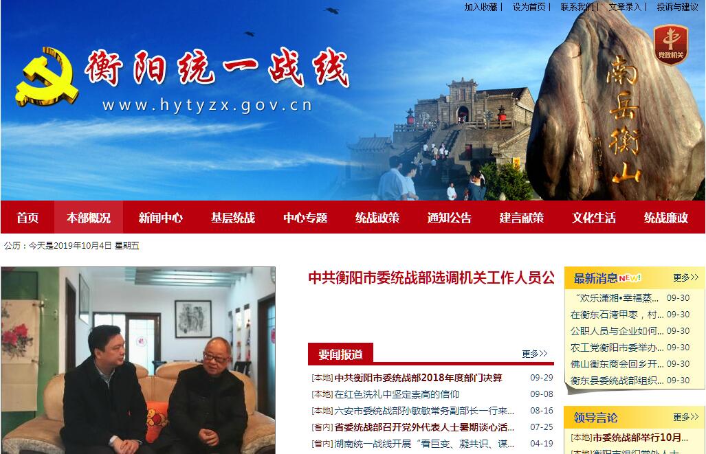 衡阳统一战线网由中共衡阳市委统战部主办。中共衡阳市委统战部主要职责:(一)贯彻落实加强党对统一战线工作集中统一领导的要求,发挥市委在统战工作方面的参谋机构、组织协调机构、具体执行机构、督促检査机构作用,了解情况、掌握政策、协调关系、安排人事、增进共识、加强团结,协调统一战线各方面关系,组织和落实中央、省委和市委关于统一战线工作重大决策部署,巩固壮大最广泛的统一战线。(二)协调开展全市统一战线重大理论研究,拟订全市统一战线政策和措施并推动落实。深入调查研究,及时向市委报告统一战线工作情况并提出建议,统筹协调和指导各县市区各部门各单位统一战线工作。(三)负责发现、培养党外代表人士,负责党外人士的政治安排,会同有关部门做好安排党外人士担任政府和司法机关及其他单位领导职务的工作,协助民主党派市委、市工商联做好干部管理工作,反映和协调解决党外代表人士工作生活中的实际困难。(四)贯彻落实党的宣传工作方针,统筹推进全市统战线宣传工作,拟订全市统一战线宣传工作规划并组织实施,研判涉及全市统一战线的舆情并协调有关部门应对处置。(五)负责联系各民主党派,通报情况、反映意见,贯彻落实中国共产党领导的多党合作和政治协商制度以及对民主党派的方针政策,支持、帮助民主党派加强自身建设,做好支持民主党派履行职责、发挥作用的工作。(六)贯彻落实党的民族宗教工作方针和政策,研究拟订全市民族宗教工作的政策措施并督促落实,协调处理民族宗教工作中的重大问题,领导市民族宗教事务局依法管理民族宗教事务,根据分工做好少数民族干部工作,联系、培养宗教界代表人士,引导各宗教坚持中国化方向,巩固和发展同宗教界的爱国统一战线。(七)负责联系、培养无党派代表人士,支持、帮助无党派人士加强自身建设、发挥作用。调查研究党外知识分子和新的社会阶层人士情况并提出政策建议,联系、培养党外知识分子和新的社会阶层代表人士,开展思想政治工作,指导高等学校、科研院所、国有企业等有关单位和社会组织开展党外知识分子和新的社会阶层人士统战工作。(八)参与制定、推进落实鼓励支持引导非公有制经济发展的政策,调查研究非公有制经济人士情况并提出政策建议,了解和反映非公有制经济人士的意见,团结、服务、引导、教育非公有制经济人士,促进非公有制经济健康发展和非公有制经济人士健康成长。(九)统一领导全市海外统战工作,牵头开展港澳统战工作,开展对台统战工作。联系香港、澳门、台湾有关党派、团体及代表人士,联系海外有关社团及代表人士,做好台胞、台属有关工作。做好统一战线外事管理工作。(十)统一管理全市侨务工作,贯彻落实党的侨务工作方针政策,负责拟订侨务工作规划并组织协调、督促检査落实。调查研究国内外侨情和侨务工作有关情况,管理侨务行政事务,统筹协调有关部门和社会团体涉侨工作,联系海外有关侨团和代表人士,指导推动涉侨宣传、文化交流、华文教育工作等,保护华侨和归侨侨眷在国内的合法权益。(十一)受市委委托,领导市工商联、市侨联党组,指导市工商联、市侨联工作。代管市台湾同胞联谊会、市黄埔军校同学会、市海外联谊会、市光彩事业促进会、衡阳欧美同学会衡阳留学人员联谊会。领导市社会主义学院党组,指导市社会主义学院工作。做好统一战线有关单位和团体的管理工作。(十二)协助管理县市区党委统战部部长。(十三)完成市委交办的其他任务。