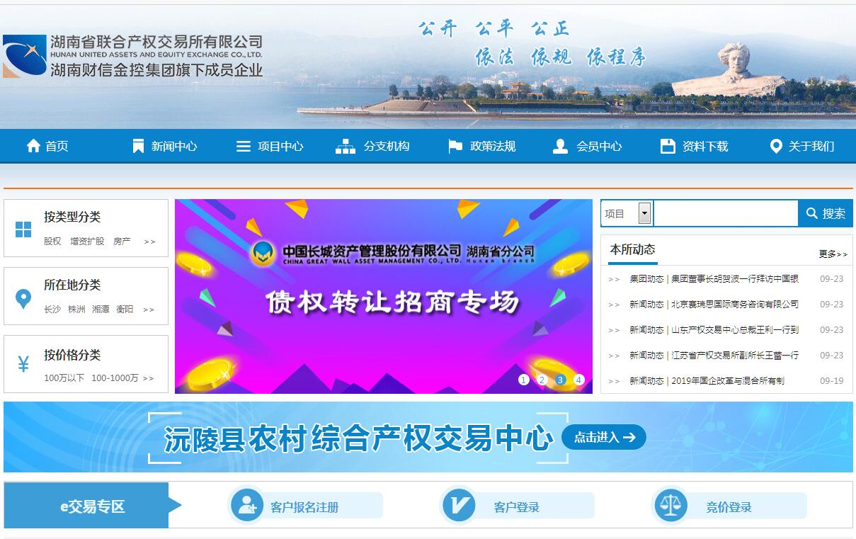 湖南省联合产权交易所有限公司(简称湖南联交所)系省人民政府批准,于2003年成立的湖南省唯一省级产权交易平台,注册资本7000万元。湖南联交所是省财政厅、省国资委等主管部门指定的相关业务交易机构,是长江流域产权交易共同市场副理事长单位、中国企业国有产权交易机构协会常务理事单位、湖南省工商局指定的产权经纪人培训机构和省纪委确认的湖南省防治商业贿赂长效机制建设的六个试点单位之一。湖南联交所是湖南财信金融控股集团有限公司控股子公司及集团交易板块的运营主体,自成立以来,始终秉承“阳光交易、价值发现”执业理念,不断加强平台和制度建设,着力拓展业务领域,从单一要素品种交易逐步发展为多个要素品种交易,发起设立了湖南股权交易所、湖南股权登记管理中心、湖南金融资产交易中心、沅陵县农村综合产权交易中心,形成了企业国有资产、行政事业单位国有资产、金融企业国有资产、农村综合产权、企业货物和服务采购、中小企业股权挂牌孵化融资、非上市公司股权登记托管、金融资产交易“八平台”的业务格局。截至2017年年底,湖南联交所已累计完成各类产权交易项目7948宗,成交金额546亿元,确立了湖南省区域产权交易市场的行业龙头地位,为建设富饶、美丽、幸福新湖南做出了积极贡献。