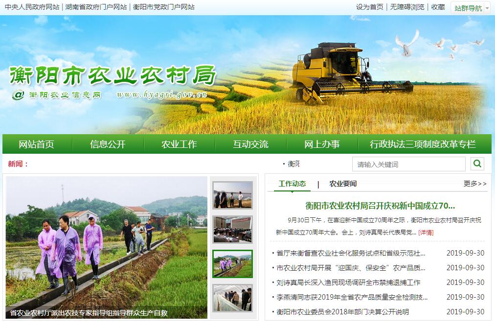 衡阳市农业农村局主要职责:(一)贯彻执行党和国家有关农业、农村工作的方针、政策,检查监督农村政策的贯彻执行;负责全市农业、农村工作的协调和综合工作,组织研究全市农业、农村发展的问题,提出农业、农村发展的政策建议,负责全市农村改革的牵头、协调、指导和督促检查。(二)会同有关部门研究提出城乡经济社会发展一体化体制机制改革建议,指导协调县域经济发展和新农村建设,研究提出县域经济发展和新农村建设的政策与规划建议,参与农村小城镇规划和建设的有关工作,参与农村社会事业发展工作,配合有关部门指导农业劳动模范管理工作,负责农村环境综合整治、文明村镇建设和乡风文明建设。(三)贯彻执行国家种植业、畜牧业、渔业、农业机械化、农产品加工业、农垦等农业各产业(以下简称农业)发展的方针政策,拟订我市农业发展的政策和规划并指导实施,参与涉农的财税、价格、金融保险、进出口等政策制定,组织拟订农业、农村经济发展的规范性文件草案,推进农业依法行政,办理农业行政审批事项。(四)研究提出稳定和完善农村经营体制的建议,指导农村土地承包、耕地使用权流转和承包纠纷仲裁管理,指导、监督减轻农民负担和村民筹资筹劳管理工作,检查监督惠农政策的落实,查处加重农民负担、侵害农民合法权益的案(事)件;指导村级集体经济发展、农村集体经济组织建设和资产财务管理,拟订全市农业产业化经营的发展规划与政策并组织实施,指导、扶持农业社会化服务体系、农村合作经济组织、农民专业合作社、家庭农场和农产品行业协会的建设与发展。(五)指导粮食等主要农产品生产,组织落实促进粮食等主要农产品生产发展的相关政策措施,引导农业产业结构调整和产品品质改善,会同有关部门指导农业标准化、规模化生产;提出农业固定资产投资规模和方向、市级财政性资金安排的建议,按权限审批、核准规划和计划内固定资产投资项目;编报部门预算并组织执行,提出扶持农业农村发展的财政政策和项目建议,经批准后与财政部门共同制订实施方案并指导实施;拟订农业开发规划并监督实施;配合财政部门组织实施农业综合开发项目;负责农口系统项目和专项资金监管。(六)负责全市农业产业化的规划、协调、指导、服务工作,促进农业产前、产中、产后一体化发展,提出农业产业保护政策建议,组织拟订促进农产品加工业、休闲农业的发展政策、规划并组织实施,指导农产品加工业、休闲农业结构调整、技术创新和服务体系建设;提出促进大宗农产品流通的政策建议,研究制定大宗农产品市场体系建设与发展规划;培育、保护和发展农产品品牌;组织协调“菜篮子”工程,负责管理全市蔬菜产业发展和城镇蔬菜产销工作;安排蔬菜资金和物资,负责新菜地开发建设基金的征收使用和监督管理。(七)承担提升农产品质量安全水平的责任,依法开展农产品质量安全风险评估,发布有关农产品质量安全状况信息,负责农产品质量安全监测;贯彻执行农业转基因生物安全评价标准和技术规范,负责农业转基因生物安全监督管理和农业植物新品种保护;会同有关部门贯彻执行农产品质量安全国家标准,参与制定农产品质量安全地方标准并指导实施;指导农业检验检测体系建设和工作考核;依法实施符合安全标准的农产品认证和监督管理;组织农产品质量安全的监督管理;负责畜禽屠宰的监督管理。(八)组织、协调农业生产资料市场体系建设,依法开展农作物种子(种苗)、草种、种畜禽、农药、兽药、饲料、饲料添加剂、食用菌菌种的许可及监督管理;贯彻执行兽药质量、兽药残留限量和残留检测方法国家标准;依法负责渔船、渔港、渔机、网具的监督管理,指导渔业安全生产;负责兽医医疗器械和有关肥料的监督管理;指导农业机械化发展和农机安全监理,组织实施农机惠农政策;会同有关部门贯彻执行农业生产资料标准。(九)负责农作物重大病虫害防治,贯彻执行国家动植物防疫检疫法律法规和政策,会同有关部门制定地方性动植物防疫政策建议并指导实施,指导动植物防疫和检疫体系建设;组织、监督对市内动植物的防疫检疫工作,发布疫情并组织扑灭;组织植物检疫性有害生物普查;承担境外引进农作物种子(种苗)检疫审批工作;组织兽医医政、兽药药政药检工作;负责执业兽医的管理。(十)承担农业防灾减灾的责任,监测、发布农业灾情,组织种子、化肥等救灾物资储备和调拨,提出生产救灾资金安排建议,指导紧急救灾和灾后生产恢复。(十一)管理农业和农村经济信息,监测分析农业、农村经济运行,开展相关农业统计工作,采集、发布农业和农村经济信息,负责农业信息体系建设,指导农业信息服务。(十二)制定农业科研、农技推广的规划、计划和有关政策并指导实施;会同有关部门组织全市农业科技创新体系和农业产业技术体系建设,会同有关部门实施科教兴农战略,按分工组织实施农业科研重大专项;组织实施农业领域的高新技术和应用技术研究、农业科技成果转化和技术推广;负责农业科技成果管理,组织引进境外农业先进技术,指导农技推广体系改革与建设。(十三)会同有关部门拟订农业农村人才队伍建设规划并组织实施,指导协调农民教育培训和农业广播电视教育工作,指导农业教育和农业职业技能开发工作,参与实施农村实