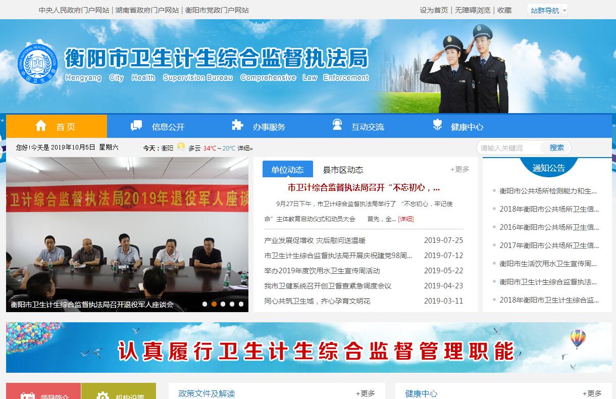 衡阳市卫生计生综合监督执法局于2015年12月16日揭牌成立,前身为衡阳市卫生监督所,是代表衡阳市卫生和计划生育委员会行使卫生和计划生育监督执法职能的机构。主要职责是承担法律法规赋予和市卫计委授权的社会公共卫生、健康相关产品、医疗机构和计划生育工作的综合监督执法任务。具体任务:一是根据法律法规对学校卫生、职业与放射卫生、公共场所卫生和计划生育实施监督;对传染病防治、母婴保健、医疗机构、采供血机构、血液及血液制品、生物制品实施卫生监督;二是依法实施预防性卫生审查,负责有关卫生许可证、培训合格证等证件的受理、审核、发放、管理工作;三是依法对违反卫生法律法规的行为进行调查、取证,实施行政处罚;四是对全市重大、跨区域的职业中毒、血液污染等公共卫生突发事件进行调查处理及实施现场卫生监督;五是对妇幼保健、计划生育技术服务内容和从业人员的行为规范进行监督,依法打击“两非”行为,做好计划生育违法违纪案件的督查督办。市卫生计生综合监督执法局先后荣获了湖南省卫生监督先进集体、湖南省打击非法行医先进单位、湖南省依法行政示范窗口单位、市三星级文明单位、市直卫生系统综合目标管理先进单位等荣誉称号。在新的起点上,市卫生计生综合监督执法局将不断坚持改革创新,开拓进取,加大执法力度,更好地服务于经济社会发展,为保障全市人民群众健康权益作出新的贡献。