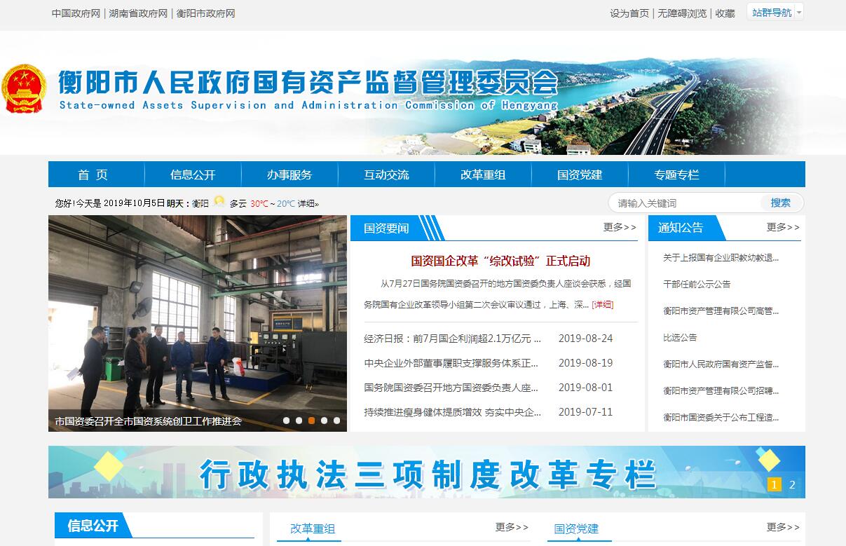 衡阳市人民政府国有资产监督管理委员会(简称市国资委),为市人民政府直属特设机构。其主要职责是:(一)根据市政府授权,依照《中华人民共和国公司法》、《企业国有资产监督管理暂行条例》等法律、行政法规履行出资人职责,指导推进国有企业改革和重组;对所监管企业国有资产的保值增值进行监督,加强国有资产的管理工作;推进国有企业的现代企业制度建设,完善公司治理结构;推动国有经济结构和布局的战略性调整;(二)依照规定代表市政府向所出资的重要骨干企业派出监事会;负责监事会的日常管理工作;(三)依照法定程序对所监管企业的企业负责人进行任免、考核,并根据考核结果对其进行奖惩;建立符合社会主义市场经济体制和现代企业制度要求的选人、用人机制,完善经营者激励和约束制度;(四)建立和完善国有资产保值增值指标体系,拟定考核标准;通过统计、稽核等方式对所监管国有资产的保值增值情况进行监管;维护国有资产出资人的权益;(五)拟定国有资产管理的地方性规章,制定有关制度;依法对县市区国有资产进行指导和监督;(六)根据市政府授权,负责对市直单位经营性国有资产、非经营性国有资产及市属金融类国有资产进行监督管理;(七)履行出资人的其他职责和承办市政府交办的其他事项。