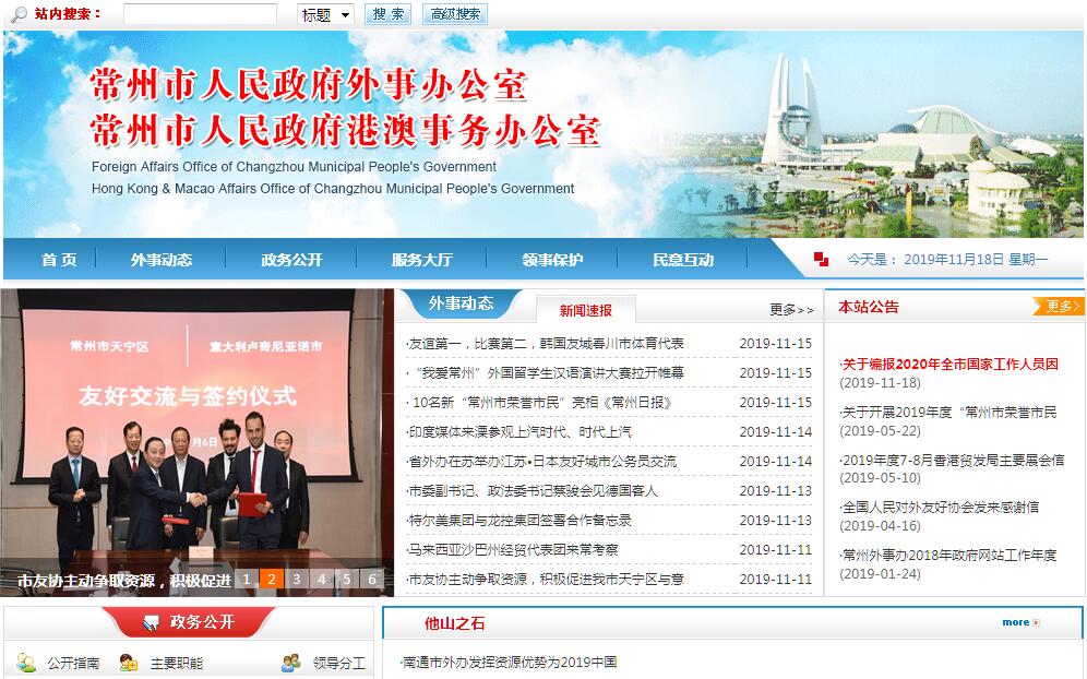 常州市人民政府外事办公室是人民政府的工作部门,贯彻执行我国的对外方针政策、涉外法规以及省、市委、政府关于外事工作的指示、决定。其主要职责是:一、贯彻执行我国的对外方针政策、涉外法规以及省、市委、政府关于外事工作的指示、决定。二、提出制订本市外事工作的规章制度和工作规划的建设;检查本市有关部门、单位贯彻执行对外方针政策和涉外法规的情况;协调本市重大外事工作、涉外活动;负责处理或协助处理本市重大涉外事务。三、负责本地区的外事调查研究工作,及时为市委、市政府的对外工作决策提供意见和建议;利用对外交往渠道,为本市的经济建设和社会发展服务。四、负责组织接待来访的党宾、国宾和其他重要外宾;负责接待、管理来本市进行公务活动的外国驻华外交人员和来常采访的外国记者;协助市委、市政府对本市需要统筹协调的重要外事事项综合归口管理;统筹安排市委、市人大、市政府和市政协领导人的外事活动;负责指导并会同有关部门做好外国人来常考察、访问的接待工作和涉外参观单位的开辟、调整和外事业务的建设工作。五、审核本市各部门、各单位报请市委或市政府审批的外事文件;承办市委、市人大、市政府和市政协领导人出访和邀请外国人地方现职副部长级以上人员来访的具体报批事宜;承办或审核、报批本市县处级及其他人员因公出国(境)和邀请外国相应人员来访的有关事宜;代拟市政府出国任务批件;负责申办本市因公出国(境)人员的护照、签证等手续和应邀来访外国人士的签证通知函电以及其他领事业务。六、负责因公出国(境)团组人员的管理,了解核查出国(境)团组、人员在国(境)外活动情况;负责牵头严格制止用公款变相出国(境)旅游和不必要的公务出国(境)活动。七、归口管理本地区友好城市工作,负责办理对外结好报批手续;制订、审核本市友好城市、地方友好交往的交流计划;负责管理市人民对外友好协会日常事务;指导本市民间友好团体以及其他地方性团体对外友好交往活动;承办、报批本市各部门成立的主要从事对外交往活动的机构、团体有关事项。八、承办本市与外国有关领事机构的业务联系和交往事宜,归口管理本市各部门、单位与外国领事机构的交往活动;会同市有关部门指导管理本市口岸的外事业务和涉外事宜。九、指导本市各部门、单位做好外国人管理工作;指导、协调有关部门管理外国专家及出国培训工作;会同有关部门做好聘请外国文教专家及其年审年检工作;会同有关部门处理本市重要涉外事件;审核、报批授予外国人荣誉市民及其名誉职务和给予重要奖励等具体事项;承办外国专家证;归口管理外事服务工作。十、依照授权、负责申办《因公往来香港、澳门特别行政区通行证》;在授权范围内,审批或审核因公临时赴香港、澳门和邀请香港、澳门相应人员来访的有关事宜;办理应邀来访的香港、澳门人士的通知函电。十一、审核、报批本市邀请外国记者来常采访事宜;指导本市有关部门、单位做好外国记者采访活动接待和安排工作;配合、协助本市党委宣传部门做好对外宣传和群众性外事教育工作;负责向本市各部门提供国际形势、对外政策、重大国际问题的宣传资料和中央、国务院的对外表态口径。十二、负责对本市外事干部、涉外人员进行对外政策和外事纪律的教育;组织外事干部对外政策业务培训;检查涉外人员守则落实情况;向有关部门提出违反外事纪律问题的处理意见、建议。十三、负责指导各辖市、区和市各部门、单位外事机构的业务工作;会同有关部门审核、报批全市涉外单位的具体事宜;负责全市翻译职称评审或报审工作。十四、办理市委市政府和省外办及上级有关部门交班的其他外事事项。