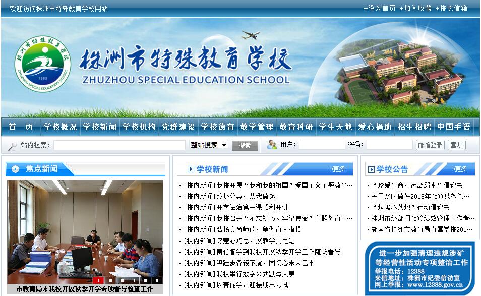 株洲市特殊教育学校(原名株洲市聋哑盲学校)创建于1985年,1995年在省内率先创办聋人高中教育,填补了湖南省特教学校无高中的历史空白,1998年创办聋儿学前康复教育,2002年创办启智教育。学校现已发展成为一所集聋儿学前康复教育、义务教育、高中教育、中等职业教育、启智教育和特殊教育科研为一体的综合性特殊教育学校。学校现有22个教学班,在校学生205人。师资力量雄厚,教师素质整体优良。现有教职工93人,其中专任教师89人,25名高级职称教师,4名全国优秀教师、10名省市优秀教师、3名市级学科带头人、3名市级骨干教师。学校占地30亩,建筑面积12500平方米,环境优雅,校内有200米环形跑道、100米直跑道、标准篮球场、健身房、先进的多媒体教室、学生电脑室、语训房、律动室、感统训练室和教师电子备课室、现代化听觉言语康复大楼、室内风雨操场。我校始终坚持以人为本,锐意改革,践行“饮水思源,爱国爱校”的要求,牢固树立“服务学生,育残成才”的价值取向,将学校建设成以文化教育为基础,教育科研为龙头、中等职业教育和学前康复教育为重点,融盲、聋、弱智三类残疾教育为一体的综合性特殊教育学校。坚持满足残疾学生的需求与提高办学效益相结合原则,突出创新特色,努力挖掘残疾学生的内在潜能,培养一批既有文化素养又有一技之长的残而不废的合格劳动者,使学校力争成为“管理规范,队伍过硬,设施完善,特色突出,质量优良”的现代化特殊教育学校。学校办学特色:1、文化教育与职业教育并举。通过加强职业教育,培养学生的一技之长,增强学生适应社会的能力。学校立足株洲当地社会经济实际,在传授基础文化知识的同时,先后开设了医疗护理、缝纫、工艺美术、美容美发、园林艺术、办公自动化等职业专业课。以就业为导向探索职业教育模式,走校校、校企联合办学路子,毕业生就业率达100%。1995年学校创办了湖南省第一个聋人职业高中班,首届学生有2名考入长春大学特教学院装潢艺术本科专业,填补了我省特教学校学生考入特教高等院校的历史空白。到2016年止,学校先后有100余名聋生考入长春大学特教学院、北京联合大学、天津理工学院、中州大学、长沙职业特校学院,高考升学率100%。更多的残疾学生通过掌握一技之长,毕业后走向社会,找到了适合自己的工作,成为一名自食其力的劳动者和建设者。2、注重艺体教学,促进学生全面发展。学校在抓好文化教育、职业教育的同时,十分重视学生艺体特长的培养,这是建校以来学校一直坚持的办学理念,已成为学校办学的突出特色,长盛不衰。学生体育代表队先后30次参加国家、省、市级体育竞赛,共获金牌105枚,银牌131枚,铜牌170枚,破省残疾人田径纪录12项共31人次。2002年组建的学生男子篮球队从2003年来连续代表湖南省参加全国聋人篮球锦标赛均取得较好的成绩。2005年湖南省第六届残疾学生运动会上,学校运动员获得金牌总数第一的好成绩。在2006年9月举行的湖南省第七届残运会上,学生一举夺得十一枚金牌,为株洲市在本次运动会上获得团体总分第一、金牌总数第一,作出了突出贡献。学校也被评为本届运动会的先进单位。在湖南省第八届残疾人运动会上,我校学生获得4枚金牌,12枚银牌和2枚铜牌的优异成绩,学校获“推荐人才奖”。学校狠抓文艺训练, 近年来,文艺节目在国家、省、市文艺调演中荣获8个一等奖、9个二等奖、5个三等奖。美术作品参加全国、省、市比赛,获一等奖113个、二等奖108个、三等奖188个。《洗春》获全国残疾人文艺调演二等奖,器乐伴舞《洞庭风光》获全国残疾人文艺调演三等奖,《守岁》获全国第二届聋校学生文艺调演一等奖,《等你来》获全国第二届聋校学生文艺调演三等奖,《浪花》获省聋校文艺调演三等奖,《村丫丫》获湖南省聋校文艺调演二等奖,《渴望》获株洲市中学生文艺调演一等奖,学校被评为“全国特殊艺术人才培养基地”。3、发展学前康复教育,让聋儿回归主流。学校聋儿康复教育创办于1998年,目前有在训聋儿达53人,学校配备了精湛的师资和价值近百万元的高科技康复训练设备,这在省内是独一无二的,学校提出的“医、教、练”相结合的康复教育理论也得到专家的高度评价并在省内推广。4、大力开展双休日活动。通过校内教师引导,以书法、绘画、十字绣、篮球、舞蹈等为载体,学生以高带低的“大手拉小手”、以好带差的“前手拉后手”的校内“手拉手”,以联谊、球赛、社会实践活动为载体的校外青年志愿者、义工、大中小学学生的校外“手拉手”,极大地丰富了学生的周末生活,为学生提供了发挥特长、展示才能、提高综合素质的广阔空间,提高了学生的活动能力、适应社会的能力,使他们树立了自信,安心在校学习。我校有一批廉洁奉公、务实创新的领导班子,有一支爱残乐教、团结协作、爱岗敬业的教职工队伍。自学校成立以来,各方面的工作都取得了长足发展,先后被评为“教育部哲学社会学科研究重大课题攻关项目实验学校”、“全国特殊艺术人才培养基地”、“中国特教在职教师培训基地学校”、“株洲市首批中小学学科培训基地”、“株洲市残疾人文艺、体育人才培训基地”、“株洲市中小学心育基地”,被授予“全国残疾人体育先进单位”、“湖南省特殊教育系统先进单位 ”、“湖南省残疾