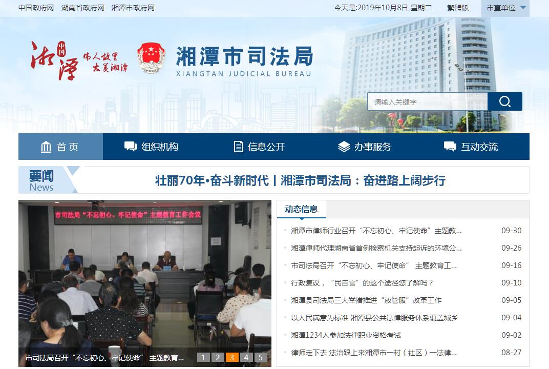 湘潭市司法局为1983年湘潭地、市司法局合并而成,属湘潭市人民政府组成部门,当时主管全市法学教育、法制宣传、律师、公证、人民调解等工作。后又新增司法鉴定、司法考试、法律援助、社区矫正、安置帮教、强制隔离戒毒等工作职能。2019年市司法局与市政府法制办职能整合,重新组建市司法局。新组建的市司法局职能概括起来讲就是:“一个统筹、四项职能”,即统筹全面依法治市工作,承担行政立法、行政执法、刑罚执行和公共法律服务职能。目前,局机关设有19个内设机构和部门。近年来,我市司法行政工作在市委、市政府的正确领导和省司法厅的精心指导下,全市司法行政系统不忘初心、牢记使命、开拓进取,取得了可喜的成绩。湘潭司法行政工作在省司法厅全面考评中名列前茅,市司法局被评为全市综治考核先进单位,原市政府法制办被评为“全省政府法制工作先进集体”“全省法治政府建设优秀单位”等。湘潭县司法局被评为“全国法治县(市、区)创建活动先进单位”,韶山市韶山乡人民调委会被评为“全国人民调解工作先进集体”,雨湖区先锋司法所被评为“全国先进司法所”,雨湖区司法局、湘潭县乌石司法所、湘乡市望春门司法所被评为“全省‘三调联动解纠纷防控风险促发展’专项调解活动先进集体”,岳塘区联合人民调委会被评为“全省优秀人民调解委员会”等。全系统涌现出“全国模范司法所长”湘潭县云湖桥司法所长杨铁强,“全国人民调解工作先进个人”胡庆、肖光尧,“全市十佳政法干警”王武华、伍锦林等一大批先进个人。随着全面依法治国的深入推进,司法行政工作职责更加重大、任务更加艰巨,全市司法行政干警将在市委、市政府的坚强领导和省司法厅的有力指导下,团结一致,振奋精神,开拓创新,锐意进取,为湘潭经济社会的稳定和发展做出新的更大的贡献。