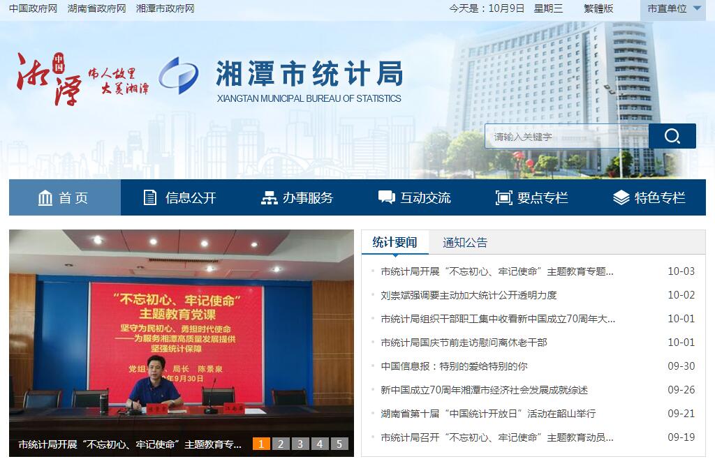 湘潭市统计局主要职责:(一)贯彻执行国家统计工作的方针、政策和统计法律法规,研究统计制度和统计方法的改革,完成国家、省和地方统计调查任务;承担组织领导和协调全市统计工作,确保统计数据真实、准确、及时;监督检查统计法律法规的实施情况,查处各类统计违法行为。(二)制定并组织实施全市统计改革和统计现代化建设规划及统计调查计划,建立健全国民经济核算体系和统计指标体系,拟订地区经济核算制度,组织实施全市及各县市区国民经济核算制度和全市投入产出调查,核算全市及县市区国内生产总值,汇编提供国民经济核算资料,监督管理全市各地国民经济核算工作。(三)会同有关部门拟订重大市情市力普查计划与方案,组织实施全市人口、经济、农业等重大市情市力普查,汇总、整理和提供有关市情市力方面的统计数据。(四)组织实施农林牧渔业、工业、建筑业、批发和零售业、住宿和餐饮业、房地产业、租赁和商务服务业、居民服务和其他服务业、文化体育和娱乐业以及装卸搬运和其他运输服务业、仓储业、计算机服务业、软件业、科技交流和推广服务业、社会福利业等统计调查,收集、汇总、整理和提供有关调查的统计数据,综合整理和提供地质勘查、旅游、交通运输、邮政、物流、教育、卫生、社会保障、公用事业等全市性基本统计数据。(五)组织实施能源、投资、消费、价格、收入、科技、人口、劳动力、社会发展基本情况、环境基本状况等统计调查,收集、汇总、整理和提供有关调查的统计数据,综合整理和提供资源、房屋、对外贸易、对外经济等全市性基本统计数据。(六)组织各地区、各部门的经济、社会、科技和资源环境统计调查。统一核定、管理、公布全市性基本统计资料,定期发布全市国民经济和社会发展情况的统计信息。组织建立服务业统计信息管理制度、共享制度和发布制度。(七)对国民经济、社会发展、科技进步和资源环境等情况进行统计分析、统计预测和统计监督,向市委、市政府及有关部门提供统计信息和咨询建议。(八)依法审批或者备案地方统计调查项目和市直各部门统计调查项目,指导专业统计基础工作、统计基层业务基础建设,建立健全统计数据质量审核、监控和评估制度,开展对重要统计数据的审核、监控和评估。(九)指导全市统计专业技术队伍建设,会同有关部门组织管理全市统计专业资格考试工作,监督管理市财政安排的统计专项经费以及上级财政安排的基本建设投资,统一管理县市区政府统计部门的统计事业费。指导全市统计科研、统计教育、统计宣传工作。(十)建立并管理全市统计信息自动化系统和统计数据库系统,组织制定各地区、市直各部门统计数据库和网络的基本标准和运行规则,指导全市统计信息化系统建设。(十一)承办市人民政府交办的其他事项。