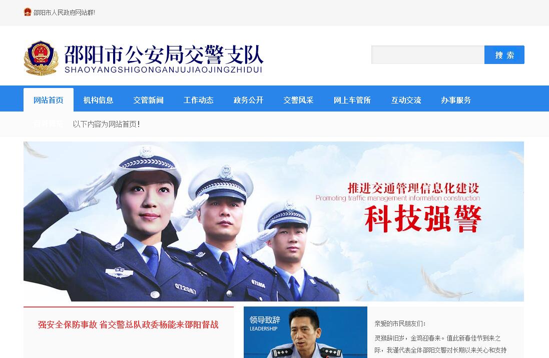 邵阳市公安局交通警察支队成立于1987年5月,1989年8月升为副处级机构,市本级现内设办公室、政工科、纪检监察室、法制科、行政财务装备科、勤务督察科、交通秩序管理科、交通事故处理指导科、宣传中心、交通安全科学技术研究所、车辆管理所、驾驶员管理所、机动车安全检测管理所等13个机构,下辖直属大队(交通违法处理教育科)、交通设施管理大队、低速汽车交通安全管理大队、特警大队等四个专业大队和双清大队、大祥大队、北塔大队三个城区大队,现有交通民警281人,工人8人,负责市本级道路交通秩序和安全管理,对全市9个县市的公安交通管理工作进行指导。全市共有交警789人,基层交警中队124个,公路通车里程21588公里,其中中级公路15153公里,高速公路284.7公里,农村公路1.4万公里,机动车保有量53.17万台,驾驶人65万余名。近年来,交警支队党委团结和带领支队全体民警致力于“政治建警、素质强警、科技兴警”,始终以“打造和谐交通,创建平安邵阳”为己任,路面交通秩序、窗口服务质量、执勤执法水平都取得了长足的进步,队伍形象有效提升。支队先后获得了“湖南省文明单位”、“省级园林式单位”、“邵阳市规范执法示范单位”、“安全生产先进单位”、“创先争优工作示范单位”、省级和市级春运工作先进单位等多项荣誉。