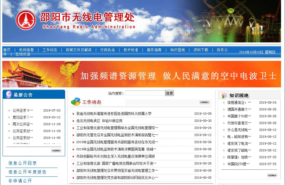 1985年,无线电管理工作由军队移交给地方政府,由此,组建了邵阳市无线电管理委员会。1997年,按国发(1997)34号文件精神,撤销各市、州无线电管理委员会,成立湖南省无线电管理委员会办公室市、州管理处,为省无委办派出机构(副处级),全称为“湖南省无线电管理委员会办公室邵阳市管理处”,简称“邵阳市管理处”,受湖南省无线电管理委员会办公室和邵阳市人民政府双重领导,归口市政府办公室,业务工作以省无线电管理委员会办公室管理为主,人事、财务等以市政府管理为主。其主要工作职责:1、贯彻执行国家无线电管理的方针、政策、法规和规章。2、根据权限审查辖区内无线电台(站)的设置、布局和台址,核发无线电台执照。3、对辖区内研制、生产、进口、销售、使用无线电发射设备实施管理。4、负责对辖区内各类无线电发射设备的技术指标进行检测。5、负责辖区内无线电管理行政执法的受理、调查、结案等工作,查处非法设置、使用的无线电台。6、负责辖区内电磁环境的监测,监测无线电台(站)是否按照规定程序和核定的项目工作,维护空中电波秩序;协调处理无线电干扰投诉,查找无线电干扰源。7、负责辖区内无线电频率占用费的征收。8、依法组织实施空中无线电管制。9、承办省无委办和当地政府交办的其它工作。