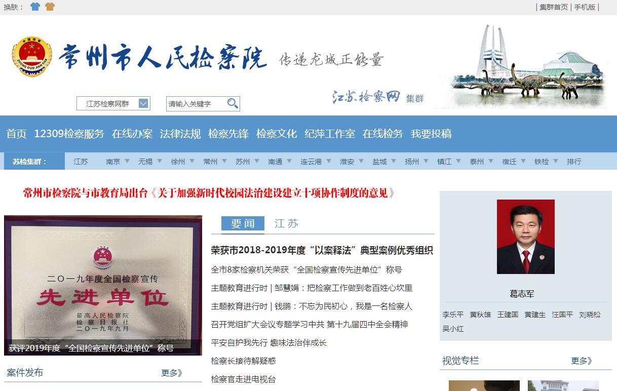 常州古称兰陵,别称龙城,季子故里,人文荟萃,因物华天宝而素有“人邑名都、中吴要辅”之誉,既是一座有着2500多年悠久历史的文化名城,也是充满现代气息、经济发达的新兴工业城市。常州市人民检察院恢复重建于1978年,下辖溧阳市、金坛区、武进区、新北区、天宁区、钟楼区、经开区7个基层院和1个派出检察院(天目湖地区人民检察院),在主要乡镇设有科级建制乡镇检察室11个,有5家基层院获全国模范检察院、全国先进检察院称号。全市现有检察干警566人,其中,员额检察官228人,本科以上学历达95.58%,硕士研究生以上学历达26.68%。近年来,在市委和省检察院的领导下,常州检察机关以“民生检察”作为特色工作,围绕我市全面深化改革和现代化建设大局,积极投入平安常州、法治常州建设,全面履行各项法律监督职能,全面落实从严治检要求,稳步推进检察改革,打造民生检察品牌,各项工作取得了长足进步。在全国人大常委会授权后提起全国检察机关首例民事公益诉讼案件,被最高检确定为全国指导性案例,获评2016年江苏省“十大法治事件”,促成建立全省首家环境公益律师队伍;根据上级院要求积极参与重大腐败案件的办理,圆满完成了中国科学技术协会原党组书记申维辰受贿、山西省政协原副主席令政策受贿、河北省原政法委书记张越受贿等案件的审查起诉和出庭公诉工作,受到中央政法委、省、市委和上级院一致好评;办理了全省首例利用P2P网贷平台非法吸收公众存款案,为全省办理此类案件提供了经验;打造了环境保护联动执法、检察为民服务中心、“常检云”信息平台、预防职务犯罪警示教育基地、驻派出所检察官联络员工作等一批特色品牌,涌现出以全国全省先进基层检察院、全国检察机关科技强检示范院、全国检察文化建设示范院、“全国模范检察官”吴小红为代表的一批先进集体和个人。