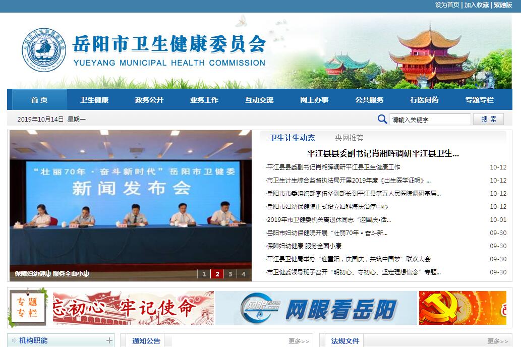 岳阳市卫生健康委员会主要职责:一、贯彻执行国民健康政策及国家和省关于卫生健康工作的方针政策和法律法规,拟订并组织实施全市卫生健康政策、规划,组织实施国家、省卫生健康地方标准和技术规范。统筹规划全市卫生健康服务资源配置,指导区域卫生健康规划的编制和实施。制定并组织实施推进卫生健康基本公共服务均等化、普惠化、便捷化和公共资源向基层延伸等政策措施。二、协调推进全市深化医药卫生体制改革,研究提出全市深化医药卫生体制改革政策、措施的建议。组织深化公立医院综合改革,推进管办分离,健全现代医院管理制度。制定并组织实施推动卫生健康公共服务提供主体多元化、提供方式多样化的政策措施,提出医疗服务和药品价格政策的建议。三、制定并组织落实全市疾病预防控制规划、免疫规划以及严重危害人民健康公共卫生问题的干预措施。负责卫生应急工作,组织指导全市突发公共卫生事件预防控制和各类突发公共事件的医疗卫生救援。承担传染病疫情信息上报工作,发布突发公共卫生事件应急处置信息。四、组织拟订并协调落实应对人口老龄化政策措施,推进老年健康服务体系建设和医养结合工作。五、贯彻执行国家药物政策和国家基本药物制度,开展药品使用监测、临床综合评价和短缺药品预警。组织开展食品安全风险监测,负责食源性疾病及与食品安全事故有关的流行病学调查。六、负责职责范围内的职业卫生、放射卫生、环境卫生、学校卫生、公共场所卫生、饮用水卫生等公共卫生的监督管理。负责传染病防治监督,健全卫生健康综合监督体系。七、制定全市医疗机构、医疗服务行业管理办法并监督实施,建立医疗服务评价和监督管理体系。会同有关部门实施卫生健康专业技术人员资格标准。制定并组织实施医疗服务规范、标准和卫生健康专业技术人员执业规则、服务规范。八、负责计划生育管理和服务工作,开展人口监测预警,研究提出人口与家庭发展相关政策建议,提出完善计划生育政策建议。九、指导全市卫生健康工作,指导基层医疗卫生、妇幼健康服务体系建设,加强全科医生队伍建设。推进卫生健康科技创新发展。十、负责全市健康教育、健康促进和卫生健康信息化建设等工作。组织实施国际、港澳台的交流合作与援外工作。十一、负责市保健对象的医疗保健工作,负责重要来宾、重要会议与重大活动的医疗卫生保障工作,指导全市保健工作。十二、指导市计划生育协会的业务工作。十三、完成市委、市政府交办的其他事项。