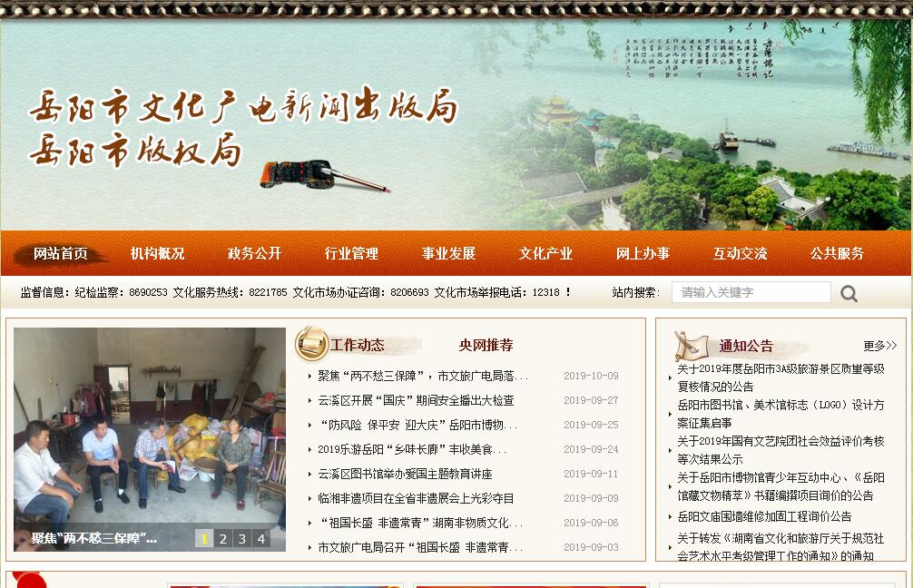 根据《中共湖南省委办公厅湖南省人民政府政府办公厅关于印发<岳阳市机构改革方案>的通知》(湘办〔2018〕61号)和《关于印发<岳阳市文化旅游广电局职能配置、内设机构及人员编制规定>的通知》(岳办〔2019〕35号)精神,设立岳阳市文化旅游广电局(以下简称市文旅广电局)是市政府工作部门,加挂岳阳市文物局牌子。市文旅广电局贯彻落实党中央和省委、省政府关于文化、旅游、广播电视和文物工作的方针政策和决策部署,全面落实市委关于文化、旅游、广播电视和文物工作的部署要求,在履行职责过程中坚持和加强党对文化、旅游、广播电视和文物工作的集中统一领导。其主要职责是:(一)研究拟订全市文化、旅游、广播电视、网络视听节目服务管理、文物和博物馆事业的政策措施,加强广播电视阵地管理,把握正确的舆论导向和创作导向。起草文化、文物事业的地方性法规、规章草案。(二)统筹规划文化事业、文化产业、旅游业、广播电视业和文物事业发展,拟订发展规划并组织实施,推进文化和旅游融合发展,推进文化和旅游体制机制改革。(三)管理全市性重大文化和旅游活动,指导全市重点文化设施、旅游设施和广播电视重点基础设施建设,组织全市文化和旅游整体形象宣传推广,促进文化产业和旅游产业对外合作和国际市场推广,制定旅游市场开发战略并组织实施,指导、推进全域旅游。(四)指导、管理文艺事业,指导艺术创作生产,扶持体现社会主义核心价值观、具有导向性代表性示范性的文艺作品,推动各门类艺术、各艺术品种发展。(五)负责全市公共文化事业发展,推进全市文化和旅游公共服务体系建设,深入实施文化惠民工程,统筹推进基本公共文化服务标准化、均等化。组织实施公共服务重大公益工程和公益活动,扶助老少边贫地区广播电视建设和发展。(六)指导、推进文化和旅游科技创新发展,推进文化和旅游行业信息化、标准化建设。(七)负责推动完善全市文物和博物馆公共文化服务体系建设,拟定文物和博物馆公共资源共享规划并推动实施。指导全市文物和博物馆的业务工作,协调博物馆间的交流与协作。(八)负责全市非物质文化遗产保护,推动非物质文化遗产的保护、传承、普及、弘扬和振兴。(九)统筹规划全市文化产业和旅游产业,组织实施文化和旅游资源普查、挖掘、保护和利用工作,促进文化产业和旅游产业发展。指导、协调、推动广播电视领域产业发展,制定发展规划、产业政策并组织实施。(十)指导全市文化和旅游市场发展,对文化和旅游市场经营进行行业监管,推进文化和旅游行业信用体系建设,依法规范文化和旅游市场。负责对各类广播电视机构进行业务指导和行业监管,会同有关部门对网络视听节目服务机构进行管理。(十一) 指导全市文化市场综合执法,组织查处全市性、跨区域文化、文物、出版、广播电视、电影、旅游等市场的违法行为,督查督办大案要案,维护市场秩序。(十二) 指导、管理全市文化、旅游、广播电视和文物对外及对港澳台交流、合作和宣传、推广工作,组织大型文化和旅游对外及对港澳台交流活动,推动岳阳文化走出去。负责广播电视节目的进口、收录和管理。(十三) 指导电视剧行业发展和电视剧创作生产。监督管理、审查广播电视节目、网络视听节目的内容和质量。指导、监管广播电视广告播放。(十四) 指导、协调广播电视全市性重大宣传活动,指导实施广播电视节目评价工作。(十五) 负责推进广播电视与新媒体新技术新业态融合发展,推进广电网与电信网、互联网三网融合。(十六) 组织制定广播电视科技发展规划、政策并组织实施和监督检查。负责对广播电视节目传输覆盖、监测和安全播出进行监管,指导、推进国家应急广播体系建设。指导、协调广播电视系统安全和保卫工作。(十七) 指导文化、旅游、广播电视、网络视听、文物等行业人才队伍建设。(十八) 协调指导全市文物和博物馆安全防范工作。履行文物行政执法督察和文物安全督察职责,配合有关部门查处文物违法的重大案件。(十九) 承办市委、市政府交办的其他任务。