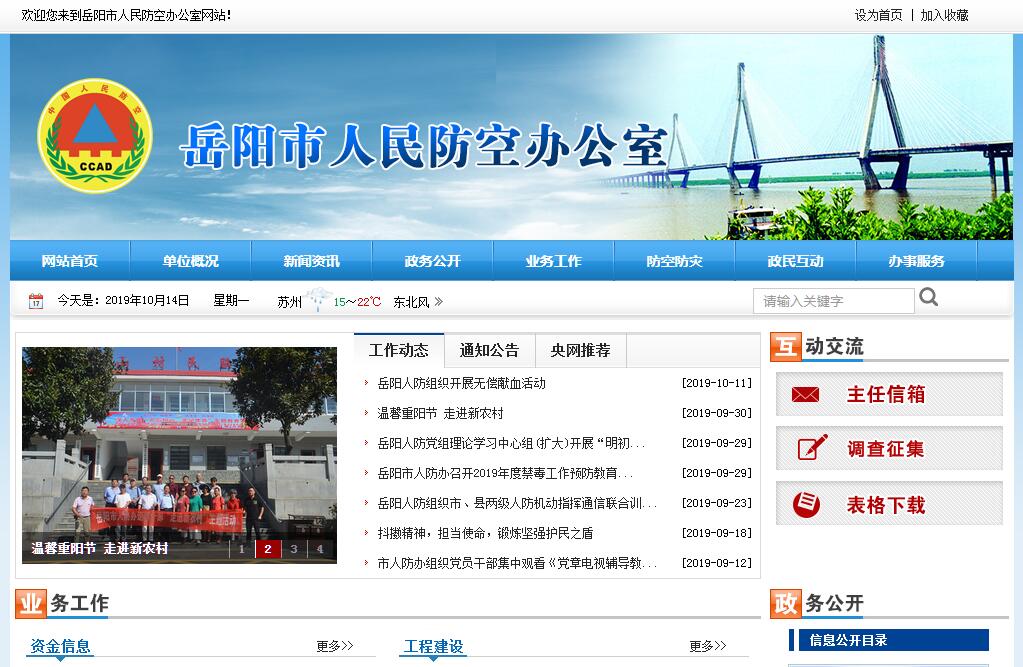 岳阳市人防办是市人民政府人民防空工作主管部门,也是市国防动员委员会常设办事机构,接受市政府和军分区双重领导。其主要职责有:1、贯彻和监督执行国家、省关于人民防空的法律、法规和政策,拟订全市人民防空的基本战略方案,编制中长期发展规划和年度工作计划,经批准后组织实施。2、根据国家批准的防护类别、防护标准,会同有关部门编制和审批人民防空建设与城市建设相结合的规划;审核城市总体规划中有关贯彻落实人民防空要求及人民防空建设规划情况,依法对城市重要经济目标的人民防空建设进行监督检查。3、组织和指导制订城市防空袭方案;监督检查群众防空组织建设、训练;组织协调应急求援、抢险救灾工作。4、组织管理人民防空通信警报建设;对人民防空通信警报网建设实施计划、技术和质量管理,监督保证全市人民防空通信警报畅通;实施人防无线电管制。5、组织管理人民防空工程建设;根据国家和省批准的防护标准和质量标准,对人民防空工程建设实施计划、技术和质量管理;指导和监督结合民用建筑修建防空地下室工作;监管人民防空工程维护管理和平时开发利用;在城市地下空间的开发和利用中监督落实人民防空要求的工作。6、会同有关部门组织开展人民防空宣传教育工作;普及人民防空知识和技能;负责组织人民防空干部、职工的教育培训工作。7、管理人民防空经费和资产;编制人民防空经费预决算,对使用情况实施监督检查。8、组织人民防空工程、通信、防化等科学技术研究,推广应用科技成果。9、战时组织开展城市人民防空袭斗争。10、承办市委、市政府、岳阳军分区和市国防动员委员会交办的其他事项。