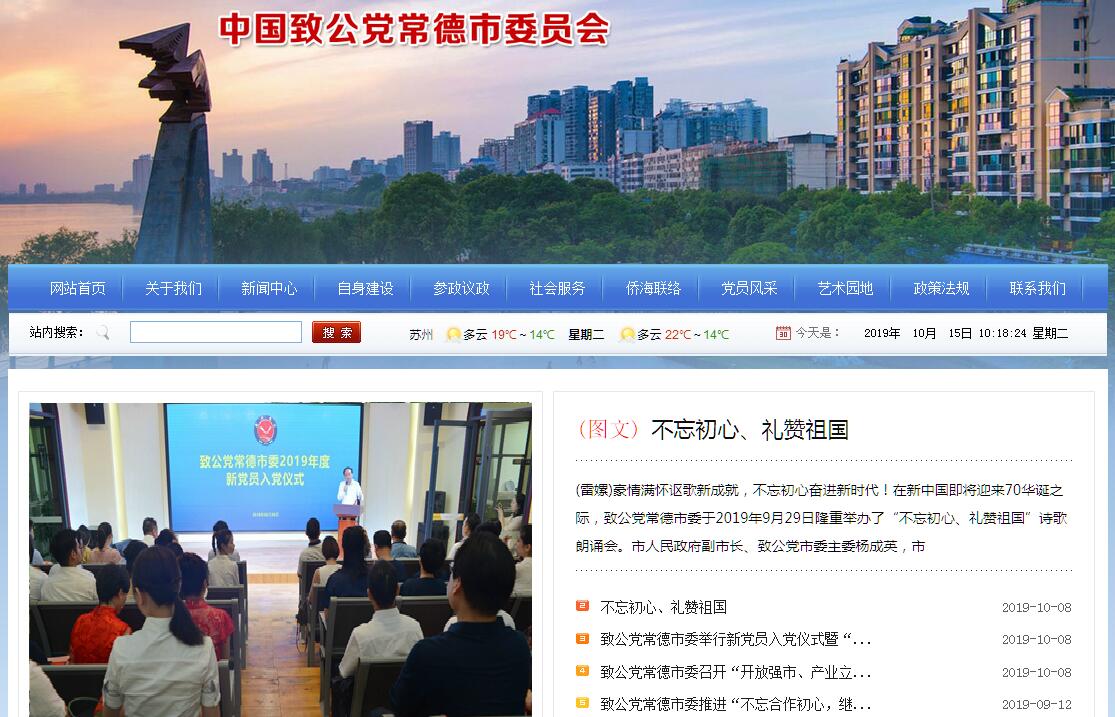 | 网站简介: 2010年10月10日,中国致公党常德市市委会成立。会议认真审议并通过了杨成英同志代表致公党常德市委筹委会所作的工作报告;选举产生了致公党常德市第一届委员会,审议并通过了大会决议。在致公党常德市委员会一届一次会议上,杨成英(女)当选为主任委员,徐晓明、潘道波当选为副主任委员,孙圣杰、黄国新、黄立新、易善元、蒯建英当选为委员。 |