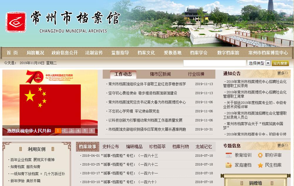 常州市档案馆位于常州市龙城大道1280号,行政中心5号楼,是永久保管常州地区重要档案资料的综合性国家档案馆。保管了从嘉庆元年(1796年)至2014年底常州地区档案史料共291个全宗60多万卷、40多万件。珍贵档案有:嘉庆元年(1796年)董婉贞的蝇头小楷扇面、同治五年(1866年)形成的《鱼鳞册》等;特色档案有大成纺织染公司的档案等。近年来,常州档案事业得到了长足发展,档案管理方式更加先进,档案馆社会功能不断拓展,已成为社会各界利用档案史料的中心、政府信息公开场所、省级爱国主义教育基地、国家级中小学档案教育社会实践基地。从单一的文书档案到科技档案、专门档案、特殊载体档案等各种不同门类的档案,从纸质档案到实物档案,特别是民生档案工作的大力推进,显示出档案工作服务领域在不断向经济、社会、家庭全面延伸,档案工作正以大发展、大开放的姿态,融入到寻常百姓生活中去,积极发挥档案在存史、资政、教育上无可替代的作用,全市档案事业发展跃上了新的历史平台。2007年,市档案馆获得“全国档案系统先进集体”最高荣誉;2008年,在全国地级市中作为首家晋升为国家一级档案馆;2011年,成为全省唯一、全国首批12家国家级中小学档案教育社会实践基地之一;2012年,被评为“创建全国文明城市先进单位突出贡献奖”;2014年,创成全省省辖市首家5A级数字档案馆;2015年11月,常州市档案局被常州市建设文明城市指挥部评为“先进集体”奖。常州市档案馆将以科学发展观为指导,紧紧围绕服务“两个率先”和推动科学发展、建设幸福和谐常州的主题,统领发展全局,落实创新举措,服务全市经济社会发展大局,推进档案馆事业向公共开放服务型转变,加快档案信息资源数字化和服务网络化的战略性突破,构建档案事业服务公众、服务社会的开放体系,促进档案事业与经济和社会各项事业协调发展。常州市档案局(馆)主要职责:(一)宣传贯彻执行党和国家有关档案工作的方针、政策和法律、法规。结合本地档案工作实际,拟订常州市档案事业发展规划及有关政策、规定,编制年度计划并监督实施。(二)对全市档案事业实行统筹规划,宏观管理。组织、指导、监督、检查、协调市属机关、团体、企事业单位以及其他组织和各辖市、区的档案工作。(三)坚持集中统一管理原则,依法接收市级机关、团体、直属单位及部分企事业单位和其他组织的重要档案资料。依法收集散存在社会和个人手中有关常州地区的重要档案和历史资料。集中管理和利用市级机关文件档案。保守党和国家机密,维护档案的完整与安全。(四)组织《档案法》和有关法律法规的贯彻实施,实行行政执法责任制,组织档案执法检查,查处档案违法行为。(五)组织档案宣传和档案干部的教育培训工作,组织全市档案系列职称评审工作。(六)组织档案学理论的研究工作,大力推进全市档案工作的科学化和现代化管理。(七)按照国家有关法律法规,做好档案的密级变更和解密工作。定期公布开放档案目录,依法向社会开放档案。(八)服务大局,配合党委和政府中心工作,有计划地编辑出版档案史料,积极向社会提供广泛的服务。(九)指导档案学术团体活动,组织全市档案工作的外事活动和国际交流。(十)承办市委、市政府和上级档案部门交办的其他事项。