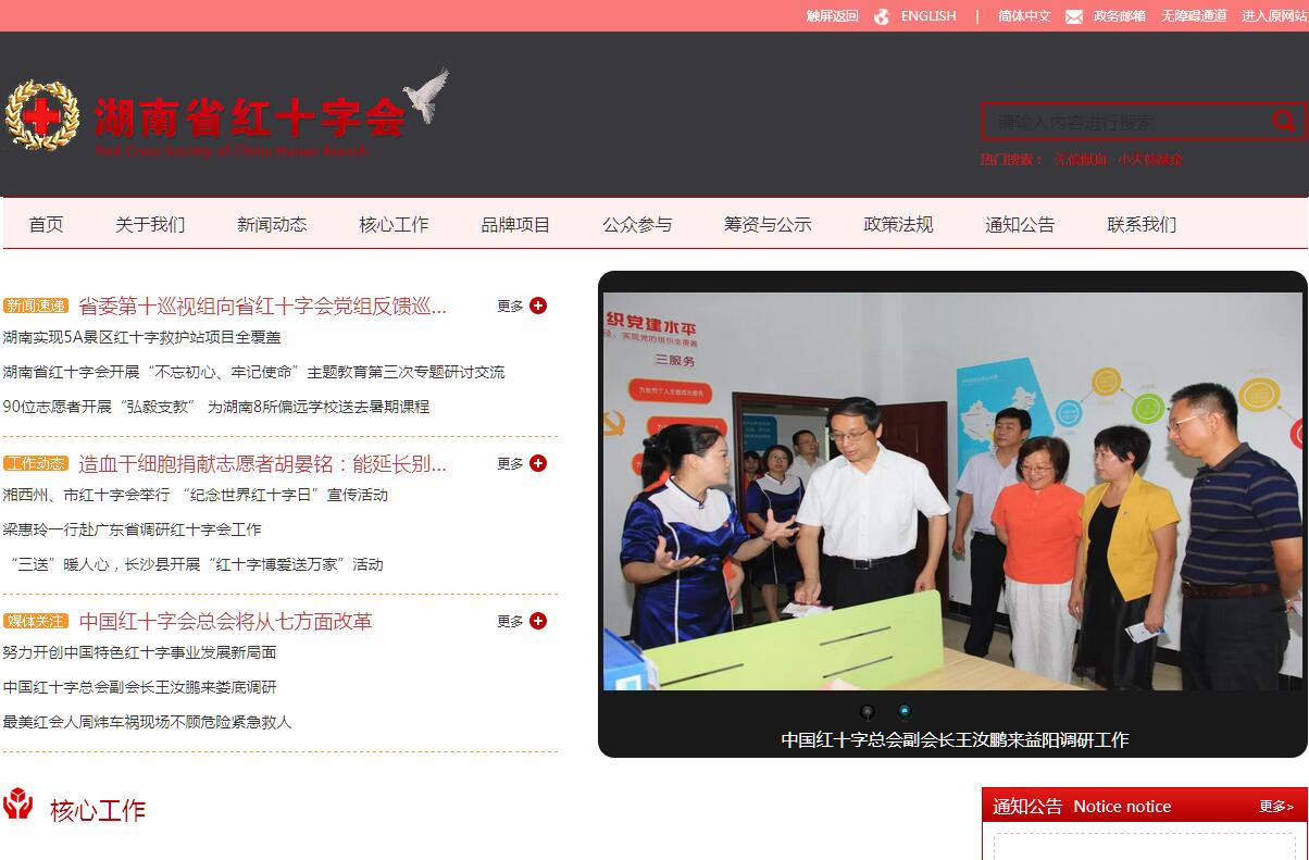 湖南省红十字组织始建于1911年,当时按照中国红十字总会要求共建立了23个分会。 湖南省红十字会正式成立于1956年11月。60多年来,湖南省红十字会坚持以保护人的生命和健康、发扬人道主义精神、促进和平进步事业为宗旨,以改善最易受损害群体境遇为基本目标,遵循人道、独立、公正、中立、统一、普遍和志愿服务的国际红十字运动七项基本原则,认真履行《中华人民共和国红十字会法》和《湖南省实施〈中华人民共和国红十字会法〉办法》赋予的职责,积极发挥了在政府人道领域工作中的助手作用。 1993年,《中华人民共和国红十字会法》颁布实施后,与全国各级红十字会组织一样,湖南省红十字会由原来的人民卫生救护团体转变为人道主义社会救助团体。2002年,湖南省红十字会由原来省卫生厅代管的处级机构,改为省政府领导直接联系的独立机构。机关设办公室、赈济服务部、救护培训部、事业发展部、机关党委,同时管辖省备灾培训中心、省造血干细胞资料库管理中心、省器官捐献管理中心,三个直属事业单位,现有专职工作人员53名。在全省14个市(州)、122(市、区)个县均设立了红十字会机构,现共有基层组织4700多个,会员81万余人。在传播国际人道法及红十字运动基本知识、备灾救灾、初级卫生救护培训、社区服务、造血干细胞捐献、推动无偿献血、红十字青少年和国际友好交往等方面做出了重大成绩,为湖南的经济社会发展和精神文明建设做出了贡献,受到社会各界的赞誉。