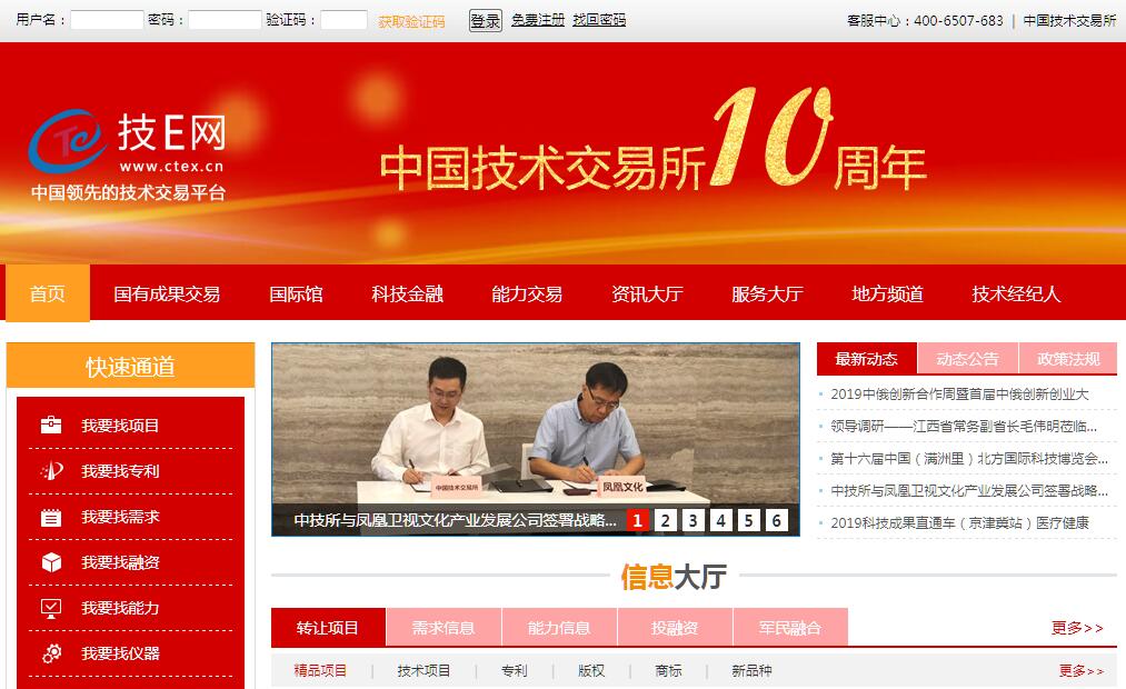 中国技术交易所(下称“中技所”)是经国务院批准,由北京市人民政府、科技部、国家知识产权局和中科院联合共建的技术交易服务机构,注册资金2.24亿元。自2009年组建以来,中技所在国家和地方各级政府部门的指导和支持下,确立了“立足北京、服务全国、建设具有国际影响力的技术交易中心市场”的发展目标,以技术交易为核心,围绕科技成果转化、企业转型升级和区域创新发展提供专业化服务。中技所的创新资源来自于全国乃至全球30余个国家、专业服务遍布全国各地,年交易额超过340亿元,累计交易额突破1000亿元。中技所在科技部和北京市科委支持下,承担国家科技支撑计划项目-“国家技术交易全程服务公共支撑平台”,并依托该项目建成“技E网”(www.ctex.cn)。该平台2013年进入试运营阶段,2014年12月正式上线,已陆续推出信息披露、网络竞价、路演展会、挂牌交易、推介撮合、成交信息公示等功能模块,截止至2017年底,已建成67个地方频道、17个专业频道和3个国际频道,累计拥有注册用户超过100000名,优质项目积累超过320000余项,并向各地客户推荐超过100000项,累计为各类用户提供专家、人才、仪器、投融资等创新服务资源超过50000次,通过网络竞价的方式,累计服务各类企业超过50000次,通过在线路演、网络展会、竞价交易等信息化的手段辅助各类客户线下活动超过100场,与对接韩国、俄罗斯、新加坡、德国等十个国家,170余家高校及研发机构,已成为中国领先的技术交易网络平台。