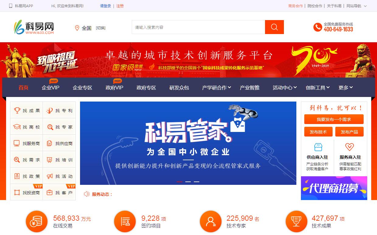 科易网( www.1633.com ) 由厦门科易网科技有限公司创建于2007年5月,创始人为林国海先生。作为科技服务行业的领军企业,科易网是卓越的城市技术创新服务平台,是优秀的城市科技创新服务提供商。科易网以技术创新为主题,面向企业、机构、政府三大主体提供服务。十余年来,科易网始终以推动技术交易与科技创新为主轴,借助“互联网 + 人工智能 + 科技服务”模式,依托线上平台,开展线上与线下相结合的技术转移与科技服务工作,引领中国科技服务行业服务模式的变革,并在实践中彰显成效。科易网卓越的成绩得到各级政府部门及领导的高度肯定,累计到访参观考察科易网的政府部门突破700家,科技部、工信部、教育部、公安部、科技部火炬中心、国家奖励办等多个部委领导均曾专门带队考察。同时,作为科技服务行业的领军企业,科易网也得到各大媒体的广泛关注,中央电视台、各地电视台,科技部官网、科技部火炬中心官网,科技日报、经济日报、厦门日报、南方日报等新闻媒体均对科易网及科易网运营的区域技术市场创新服务模式进行多次报道,其中《新华日报》还在报道中评价科易网是国内运营最成功的科技成果转化服务平台!由首都科技服务业协会、中国标准化研究院、厦门科易网科技有限公司、北京科技协作中心四家单位联合起草的《科技成果互联网交易服务规范》(T/BTSA 003-2017)已正式发布。该标准参照科易网的在线技术交易服务系统——“科易宝”的服务流程及实践经验制订,解决了基于互联网的科技成果交易流程规范问题,适用于各类科技成果转化平台、技术转移服务平台,是技术转移行业具有里程碑意义的事件。 目前,该标准已在科易网建设、运营的全国近百个区域技术市场实践应用,并取得良好的反馈效果,按照该标准提供的科技成果互联网交易服务,实现的在线技术交易额已超过55亿元。另外,首都科技服务业协会就在线技术交易价格评估系统标准化问题再次到访科易网展开调研,相信不久的将来在线技术交易价格评估也将有标可依。