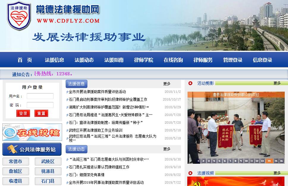 | 网站简介: 常德法律援助网,由常德市法律援助中心筹建,常德市司法局主办,该网站分内网和外网两个部分,内网主要用于工作交流。外网设有法律援助机构、法援信息、法援动态、法援案例、在线咨询、受理公示、法援视频等栏目,栏目机构设置将全面推介我市三级法律援助网络,为广大群众申请法律援助提供便利;在线咨询电话12348;网址:http://www.cdflyz.com。 |