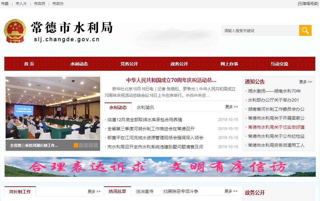 常德市水利局主要职责:(一)贯彻中央、省关于水利工作的方针政策;拟订水利工作发展战略、中长期规划;组织编制市确定的江河湖泊的流域综合治理规划、防洪规划等重大水利规划;按规定制定水利工程建设有关制度并组织实施;负责提出水利固定资产投资规模、方向,按照规定权限审批、核准水利规划内和年度规模内固定资产投资项目;提出水利建设投资安排意见并组织实施。(二)负责生活、生产经营和生态环境用水的统筹兼顾和保障;实施水资源的统一监督管理;拟订全市和跨县市区水长期供求规划、水量分配方案并监督实施;组织开展水资源调查评价工作,按规定开展水能资源普查和调查评价工作;组织有关国民经济总体规划、城市规划及重大项目的水资源和防洪的论证工作;负责重要流域、区域的水资源调度;组织实施取水许可、水资源有偿使用制度和水资源论证、防洪论证制度;指导水利行业供水和乡镇供水工作。(三)负责水资源保护工作。组织编制水资源保护规划;按规定权限组织拟订重要江河湖泊的水功能区划并监督实施;核定水域纳污能力,提出限制排污总量建议;负责入河排污口设置审核工作;指导饮用水水源保护工作;指导地下水开发利用和城市规划区地下水资源管理保护工作。(四)负责防治水旱灾害,承担市防汛抗旱指挥部的日常工作;组织、协调、监督、指导全市防汛抗旱工作,对重要江河湖库和跨县市区水利工程实施防汛抗旱调度和应急水量调度,编制市防汛抗旱应急预案并组织实施;指导水利突发公共事件的应急管理工作。(五)负责水能资源开发利用的统一监督管理;会同有关部门编制水能资源开发利用规划并监督实施;负责水能资源开发利用权有偿取得工作。(六)负责节约用水工作。拟订节约用水规范性文件,编制节约用水规划,指导和推动节水型社会建设工作。(七)组织指导水利设施、水域及其岸线的管理与保护;组织指导江河、湖泊、水库、河口、滩涂的治理和开发;负责河道管理;组织实施具有控制性的或跨县市区的重要水利工程建设及运行管理。(八)负责防治水土流失。拟订水土保持规划并监督实施;组织实施水土流失的综合防治;负责有关建设项目水土保持方案的审批、监督实施及水土保持设施的验收工作,指导重点水土保持建设项目的实施;负责水土保持规费征收制度的实施。(九)指导农村水利工作。组织协调农田水利基本建设;指导农村安全饮水、节水灌溉等工程建设与管理工作;指导农村水利社会化服务体系建设;指导农村水电农村电气化、小水电代燃料工作。(十)指导水利行业国有资产监管工作,负责对局属系统国有资产的监管工作;指导水利风景区建设与管理工作。(十一)负责重大水事违法案件的查处,受市人民政府委托,协调、仲裁部门间和跨县市区间的水事纠纷;指导水政监察和水行政执法。(十二)负责全市水利行业安全生产工作,组织指导水库、水电站大坝的安全监管;指导水利建设市场的监督管理;组织实施水利工程建设的监督。(十三)负责水利行业的科技工作;组织开展水利行业质量监督工作,组织国家、省有关水利行业的技术标准、规程规范的监督实施;指导水利队伍建设;指导水利信息化工作;承担水利统计工作。(十四)承办市委、市政府交办的其他事项。