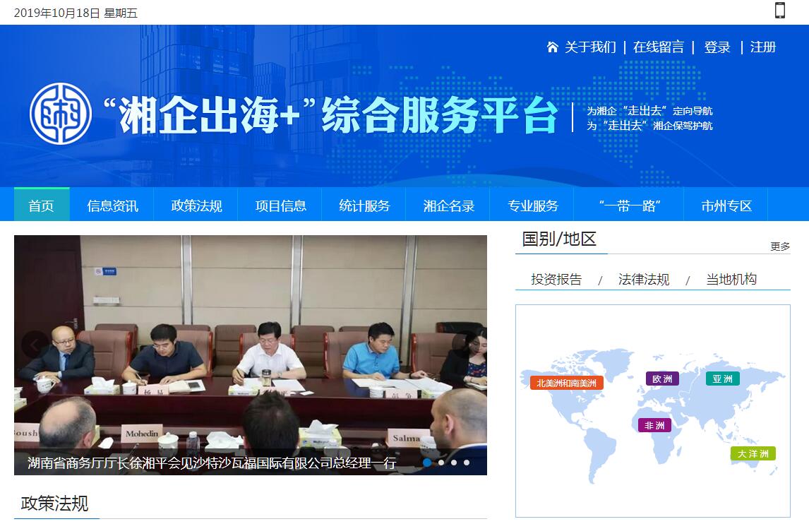 | 网站简介: “湘企出海+”综合服务平台由湖南省商务厅与建行湖南省分行共同建设开发,是湖南省为对接“一带一路”和落实“开放崛起、创新引领”战略,顺应湖南企业“走出去”发展需要而打造的湖南企业与政府部门、金融机构、第三方服务机构、相关领域专家、境外机构的对外经济合作领域的资讯及专业服务平台。平台建设的总体目标是:为湘企“走出去”定向导航,为“走出去”湘企保驾护航。“湘企出海+”综合服务平台将共享商务部中国国际电子商务中心建设的“走出去”导航网资源,以服务于湖南省企业对外经济合作的信息需求为切入点,集信息共享、项目发布、统计服务、专业服务、业务指导等多项功能为一体,旨在通过信息服务和对接服务,逐步成为湖南省对外经济合作领域的管理服务“抓手”、项目合作“能手”、企业投资“助手”和多方对接“帮手”。 |