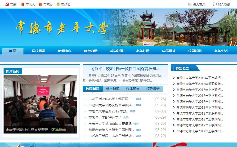 常德市老年大学位于常德市武陵区体育路20号。学校始建于1990年10月,1996年9月搬迁至现址。与市老干部活动中心实行两块牌子、一套班子的管理模式,为参照公务员管理的副处级全额拨款事业单位,归口市委老干局管理,下设综合科、教务科、活动科和教研室等4个科室。常德市老年大学院落占地面积53亩(其中水面面积35亩),拥有教学和活动两幢主楼,建筑面积11000余平方米(其中活动楼5820平方米,教学楼5470平方米,分别于1996年和2010年建成投入使用)。活动楼设有健身房、书画展厅、排练厅、报告厅、棋牌室、图书阅览室、乒乓球室等活动场所。教学楼设有通用教室6间、多媒体教室2间,电脑、电钢琴、电子琴、古筝等专业教室4间,舞蹈拳剑教室6间、会议室2间。市老年大学成立20多年来,顺应银色浪潮,从创办之初的3个专业百来人科发展到如今的拥有在校学员近10000人科,各专业教师77人(其中6人为省级优秀教师),开设声乐、器乐、戏曲、舞蹈、体育健身、文化艺术等6个系38个专业152个教学班的大型老年教育载体。作为全市最大的老年教育载体,常德市老年大学一直秉承“德行天下、乐学尚为”的校训,始终坚持“政治建校、文化立校、活动兴校、质量强校”的办学原则和“增长知识、陶冶情操、丰富生活、服务社会”的办学宗旨,在市委市政府的重视关心下,在各有关部门的大力支持下,全体教职员工齐心协力,不断加强思想政治引领,大力推进党组织建设,充分发挥正能量作用,通过成立社团、创办校刊、出版文集、举办校园艺术节、开展惠民演出等多种校园文化活动,为广大师生搭建起充分展示才艺的平台,并取得了丰硕的办学成果,学校先后被评为 “全省优秀老年大学”、“湖南省老年大学示范校”、 “全国示范老年大学”、“全国老年大学校园文化建设先进单位”,学校“三送志愿服务”被评为全市十大优秀志愿服务项目、学校党支部被评为市直十佳“先进基层党组织”,并与市委老干部局一起,被省文明委授予“省级文明标兵单位”荣誉称号。