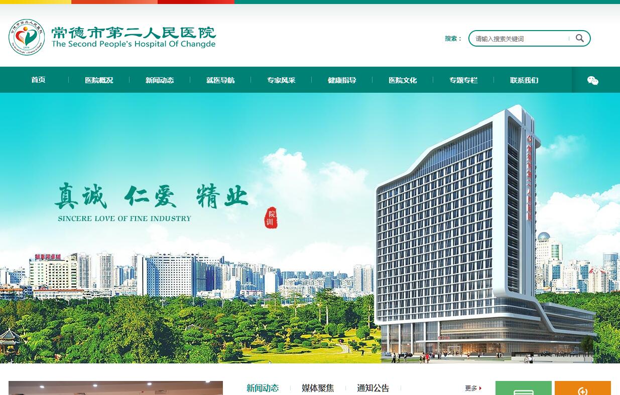 常德市第二人民医院始建于1959年,座落在工业新城常德经济技术开发区城市中心位置,是一所集医疗、教学、科研、预防为一体的三级综合医院,北京大学医学部心血管外科学系临床培训基地、湖南省助理全科医生培训基地、中南大学湘雅医院定点指导、双向转诊医院、湖南省人民医院定点指导医院、南华大学附属第一医院医疗协作、双向转诊医院及脊柱外科博士工作站、湘雅口腔医院技术指导医院、湖南圣心医生集团名医中心、常德市120紧急救援中心江南片区医院,省、市城镇职工基本医疗保险、城乡居民医疗保险定点医院,常德市突发公共卫生事件定点救治中心。医院占地面积205亩,实际开放床位671张。现有在职职工668人,离退休职工120人,其中副高及以上专业技术职称78人,中级技术职称150人,硕士20名。医疗设备先进,拥有16排高速螺旋CT、1.5T核磁共振、直线加速器、DR、四维彩超、数字减影造影仪(DSA)、高压氧舱等大型医疗设备300余台(套)。科室设置齐全,设病室18个,临床科室24个,医技科室12个,职能科室22个。能顺利开展各种危急重症病人的抢救、疑难病症的诊疗和各种疑难复杂手术。脊柱外科为常德市重点学科;疼痛专科在本市率先开展慢性疼痛治疗,达到全市先进水平,并获得多项科技进步奖;无痛胃肠镜技术处于国内领先水平;肿瘤靶向微创综合治疗技术处于全省先进水平。医院先后获得湖南省卫生系统先进集体、省卫生系统创先争优活动先进集体、省卫生系统先进基层工会、省级园林式单位、省级文明卫生单位、常德市文明单位、群众满意医院等荣誉称号。医院坚持“患者利益至上”的宗旨,秉承亲情化服务的理念,以精湛的技术为广大病友提供满意的服务。