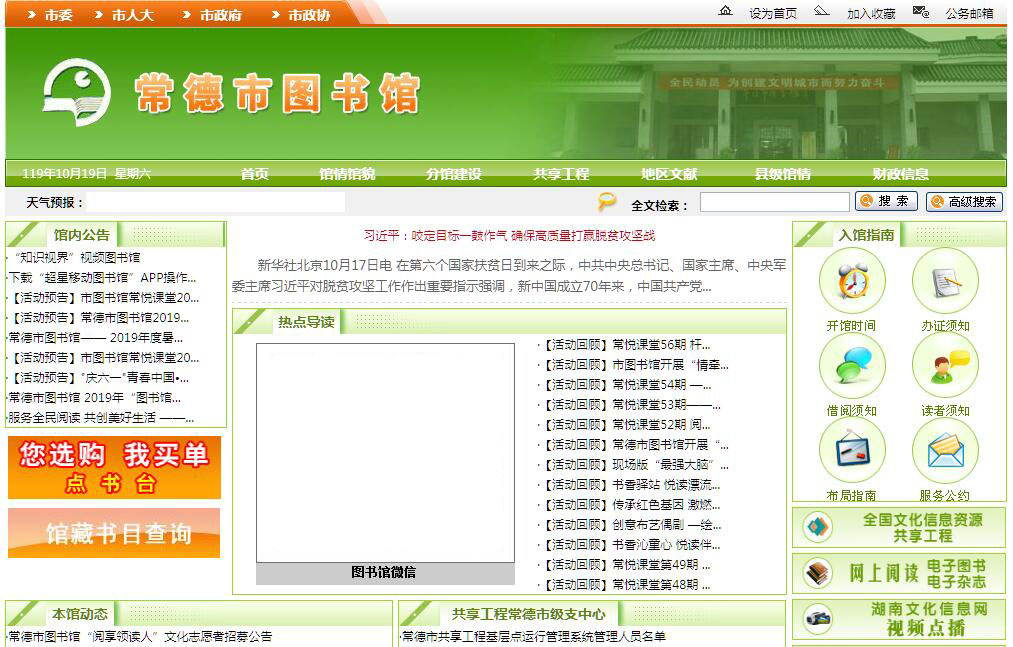 常德市图书馆始建于1903年(清光绪二十九年),雷茂才为首的五位浏阳籍留日归来的爱国志士,在现在黄金台对面的吕祖庙,创办了第一个面向公众开放的图书馆,名为“师范传习所”,迄今已有110年的历史。在以“常德市图书馆”命名之前,随着馆址的迁移,馆名也一再更替,曾用名有“通俗教育馆”、“民众图书馆”、“教育图书馆”,是我国最早以“图书馆”命名的地市级公共图书馆。现有馆舍于1988年3月对外开放,原中共中央总书记胡耀邦同志题写了馆名。馆舍面积8331平方米;总藏书量45.5万册,其中古籍线装书12385册(最珍贵的有明清刻本3种21册),各类工具书及地方文献万余种。全馆有15个服务窗口对外开放,对读者实行零门槛的全开架借阅,服务时间每周71.20小时,年接待读者30多万人次,外借书刊 28万册次。多样服务手段:1、积极推行免费开放。2008年,我馆领先全省实行全免费、全开放服务,撤除读者进馆“门槛”,图书外借实行全馆“一卡通”。到2010年6月,彻底取消了办证收费如工本费、补卡费等一切收费项目。2、开通读者“还书日期短信通知”免费服务平台,将读者借还图书的短信通知分别订制在到期的前7天和前3天发出,为读者借还图书提供了方便。3、于2011年推出了读者“点书台”专项服务,在服务总台旁设立一个“点书台”(网站上也开设相同服务栏目),让读者根据自己的喜好,点购自己需要而图书馆还没有收藏的图书。4、设立特殊读者服务部,解决了残障读者群体的阅读需求。在室内,我们配备了两台电脑、近千册专业盲文书籍和500张视听文献,为他们提供阅览视听服务。5、安装WIFI。在本馆办公室、多功能报告厅、期刊阅览室、文学外借处和未成年人借阅处分别新装了5个性能处于国内领先水平“W20E”信号发射基站,传输速率为450兆/秒,保证了无线网络信号全面覆盖馆内各处,方便读者自带设备上网学习,休闲娱乐。6、开放自修室,为满足市民的自修需求,并照顾部分读者自带书籍进馆阅读的习惯,我馆在主楼二楼新设了免费自修室,自修室内设60个舒适的阅读坐席,还配备了冷暖空调,为读者提供舒适的自修环境。7、开通“常德市图书馆”微信平台。4月17日开通,将我馆藏书资源、讲座活动、精品图书等消息推送给广大读者,是我馆打造以“物理内涵、数字内涵、文化内涵”为中心的三元结构新型图书馆文化的重要组成部分之一,它体现了图书馆“温馨化”服务理念。8、歌德电子图书借阅机。可一次同时存储2000册正版电子图书,每个月通过公司书目库更新200册,免费下载数量不限,在本馆全馆实现无线覆盖(带宽50兆)的网络下,下载一本电子图书平均耗时10秒。