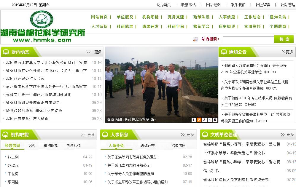 湖南省棉花科学研究所是湖南省农业农村厅下属非营利性社会公益类科研事业单位。单位前身“湖南省棉业试验场”始建于1929年,以繁殖推广陆地棉良种和植棉技术指导为主要任务;1950年澧县棉场与津市轧花厂合并组建滨湖植棉指导站、大通湖农业试验站;1960年,澧县张公庙建立棉花试验站,是湖南首个以科研为主要任务的现代棉花科研机构;1976年5月20日,湖南省委同意省革委会农村办和农业局党委意见,从贺家山原种场划出500亩耕地,成立湖南省棉花科学研究所。1978年2月27日,省革委会农业局同意本所所址由贺家山原种场迁往常德县茅湾(现茅湾院)。1985年4月11日,棉产品综合利用技术开发服务中心成立(现桥南院)。2014年7月,中共湖南省棉花科学研究所总支部委员会升格为党委。党委下设行政后勤党支部、科研第一党支部、科研第二党支部、服务与推广党支部、老干党支部等5个党支部。下设办公室、政工人事科、计划财务科、监察审计室、科研管理科、科研服务中心、棉花育种室、栽培植保室、旱地作物研究室、新疆综合试验站、检验检测中心等11个所属科室。经过40多年的发展,湖南省棉花科学研究所已成为国内先进的棉花专业研究所和重要的环洞庭湖经济作物研究中心。我所现有人员151人,其中在职71人,退休80人。在职人员中有专业技术人员49人,其中二级岗位人才2人、国务院特殊津贴专家5人、副高以上26人,科研人员占比72%。另有聘请院士1 人,院士专家站专家5人,客座教授5人。现有分子育种课题组、抗逆育种课题组、种质资源创制与杂种优势利用课题组、长江育种课题组、栽培植保课题组、区域试验课题组、新疆生态育种课题组、中药材(百合、紫苏)课题组、油料(油菜、花生、油葵)课题组、旱杂粮(玉米、甘薯)课题组等9个研究课题组。研究所主要从事棉花、中药材、油料、旱杂粮等作物遗传育种、耕作栽培、病虫害防治、副产品综合利用等技术研究与成果推广。现有科技部“国家杂交棉研究推广中心”(全国唯一)、农业部“国家棉花改良中心常德分中心”(国家首批3个之一)、农业部国家现代农业创新体系“洞庭湖棉花试验站”等3个国家级科研平台依托我所。2012年,成立了省内首家科研院所院士专家工作站。拥有试验基地500余亩,包括茅湾科研基地150亩、望城创新中心300亩、新疆库尔勒综合试验站30亩、海南冬繁基地20亩;中心实验室600平方米,配置仪器设备200余台(套),价值500余万元。建有抗病鉴定圃20亩,抗虫鉴定圃1000平方米,高标准温室640平方米,挂藏室2000平方米,保存各类种质资源6000余份。先后选育棉花新品种37个,其中国审品种5个,省审品种32个。选育的常规棉品种洞庭1号、岱红岱、湘棉10号,引领了长江流域三次棉花品种改良;选育的湘杂棉系列品种及配套技术的推广,开创了棉花杂交种F1广泛利用的先河,推动了湖南棉花生产的突飞猛进;选育的“省工棉2号”等12个机采棉,率先在长江流域启动适宜机械采收的早熟短季棉选育。先后承担国家“863”计划、国家重点研发计划、国家转基因重大专项等项目300余项,取得国内先进水平以上成果70余项。获得国家和省部级科技奖励60余项,其中国家发明奖1项,国家科技进步奖2项,省科技进步奖34项。发表论文500余篇,编著11部。通过科技下乡、万名工程服务等方式,开展技术服务、技术转移,大力示范推广科研成果。为促进成果转化,提高科技对农业生产的贡献率,2015年我所投资入股成立注册资金达3000万元的湖南天丰农业科技有限公司,占股7.5%。2017年以望城创新示范中心为载体成立湖南省晟泰农业科技有限公司和望城区晟泰专业种植合作社,成功搭建科技成果转化和技术服务平台。据不完全统计,湘杂棉在省内外累计推广种植1.5亿亩,创社会经济效益500亿元以上。
