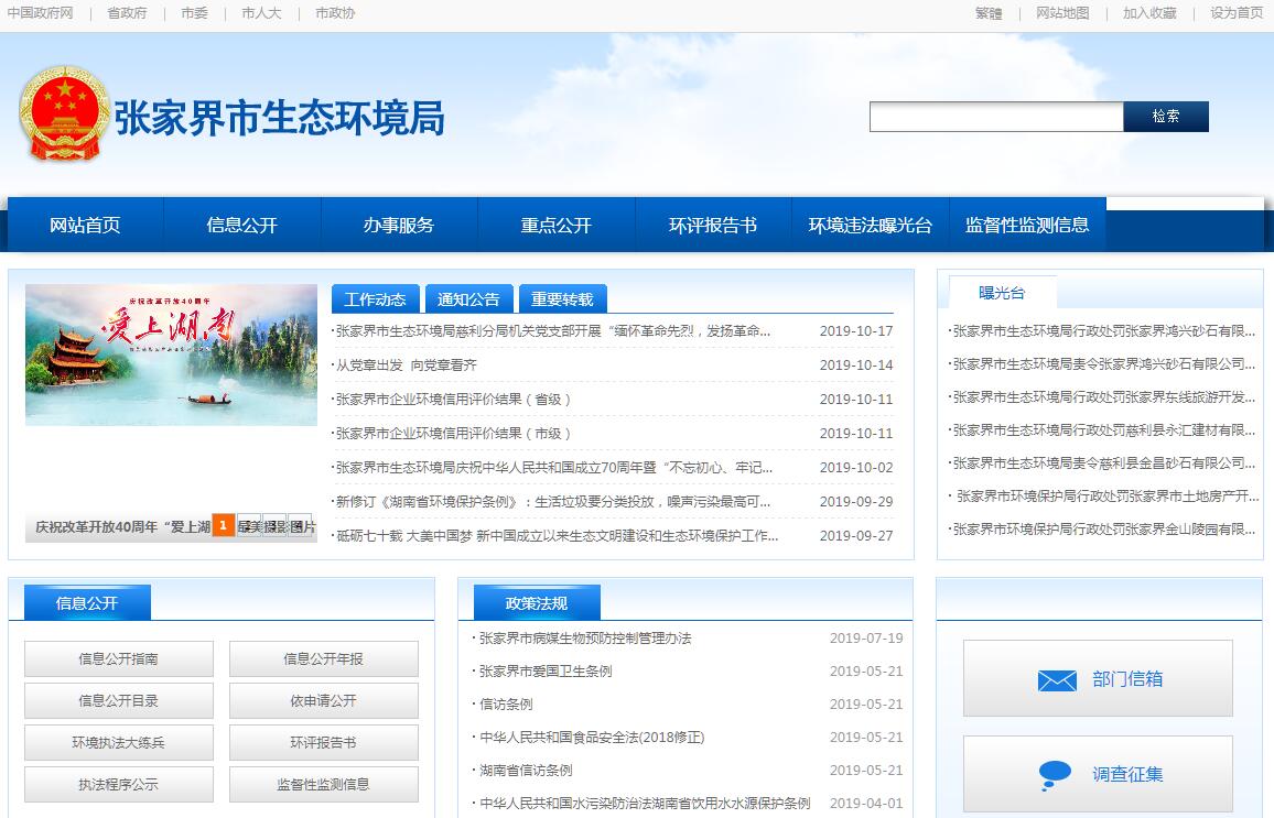 | 网站简介: 张家界市生态环境局是张家界市人民政府环境保护行政主管部门,对全市环境保护工作实施统一监督管理。局内设职能科室:办公室、法制行政审批科、规划财务科、总量控制科、污染防治科、自然生态保护科、辐射固废管理科、人事科。辖张家界市环境监察支队、张家界市环境监测中心站、张家界市环保科研所、开发区分局,设永定区环保分局、武陵源区环保分局。近几年来,张家界市生态环境局认真贯彻环境保护基本国策,以人为本,以环境为中心,突出生态环境建设,加强噪声、大气、水环境污染防治,严格执法,依法行政,坚持一心一意为经济建设服务,诚心诚意为企业和社会服务,全心全意为人民群众服务的宗旨,为改善和提高全市环境质量作出了积极贡献,物质文明和精神文明建设成效显著。 |